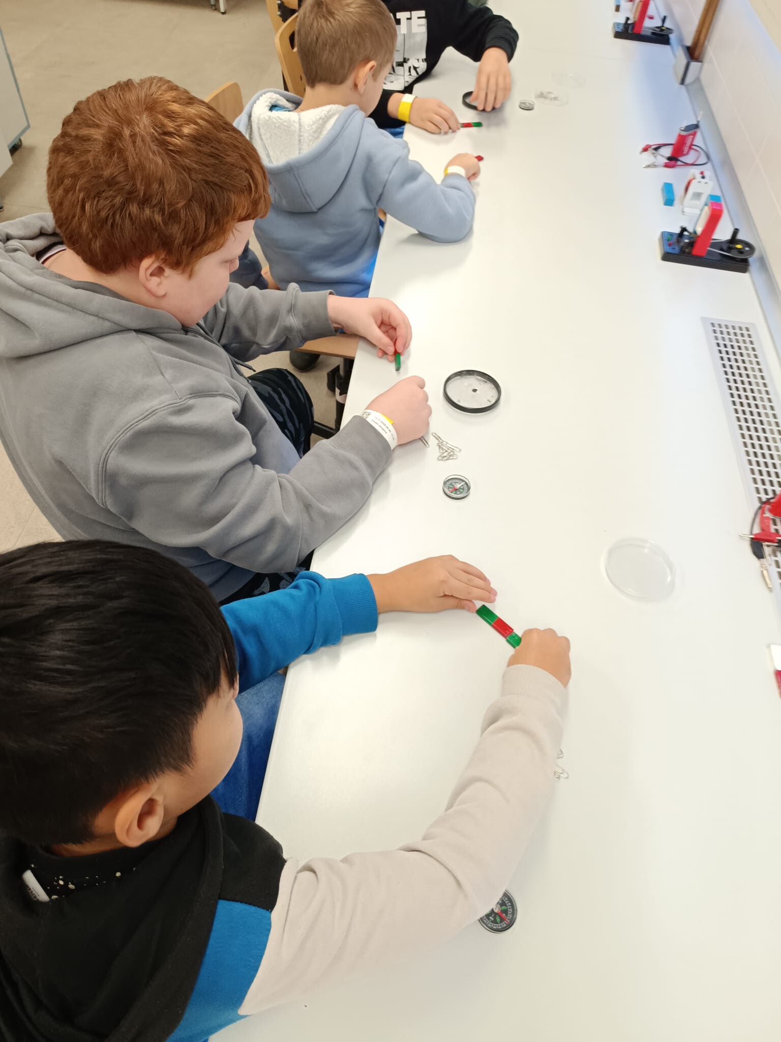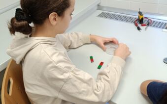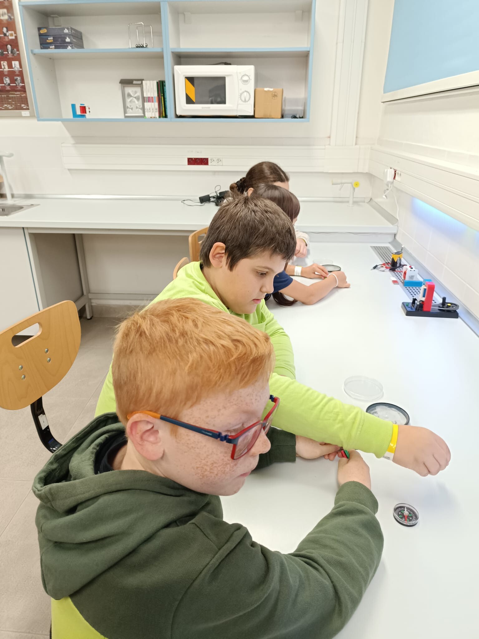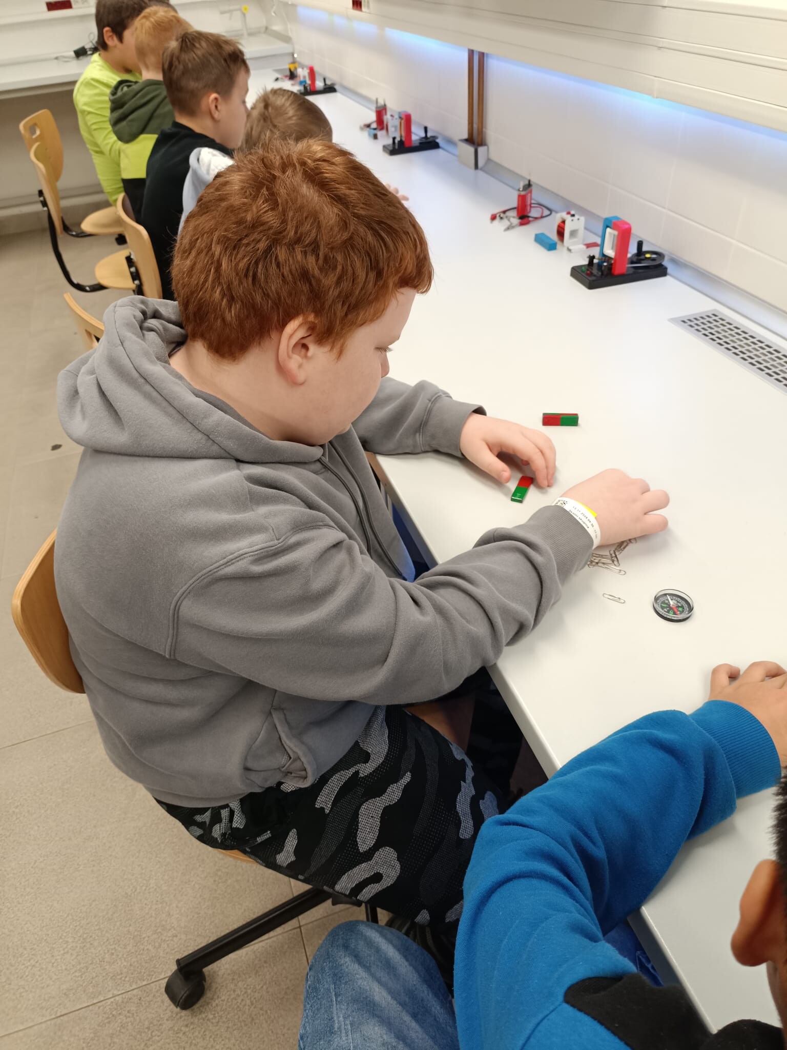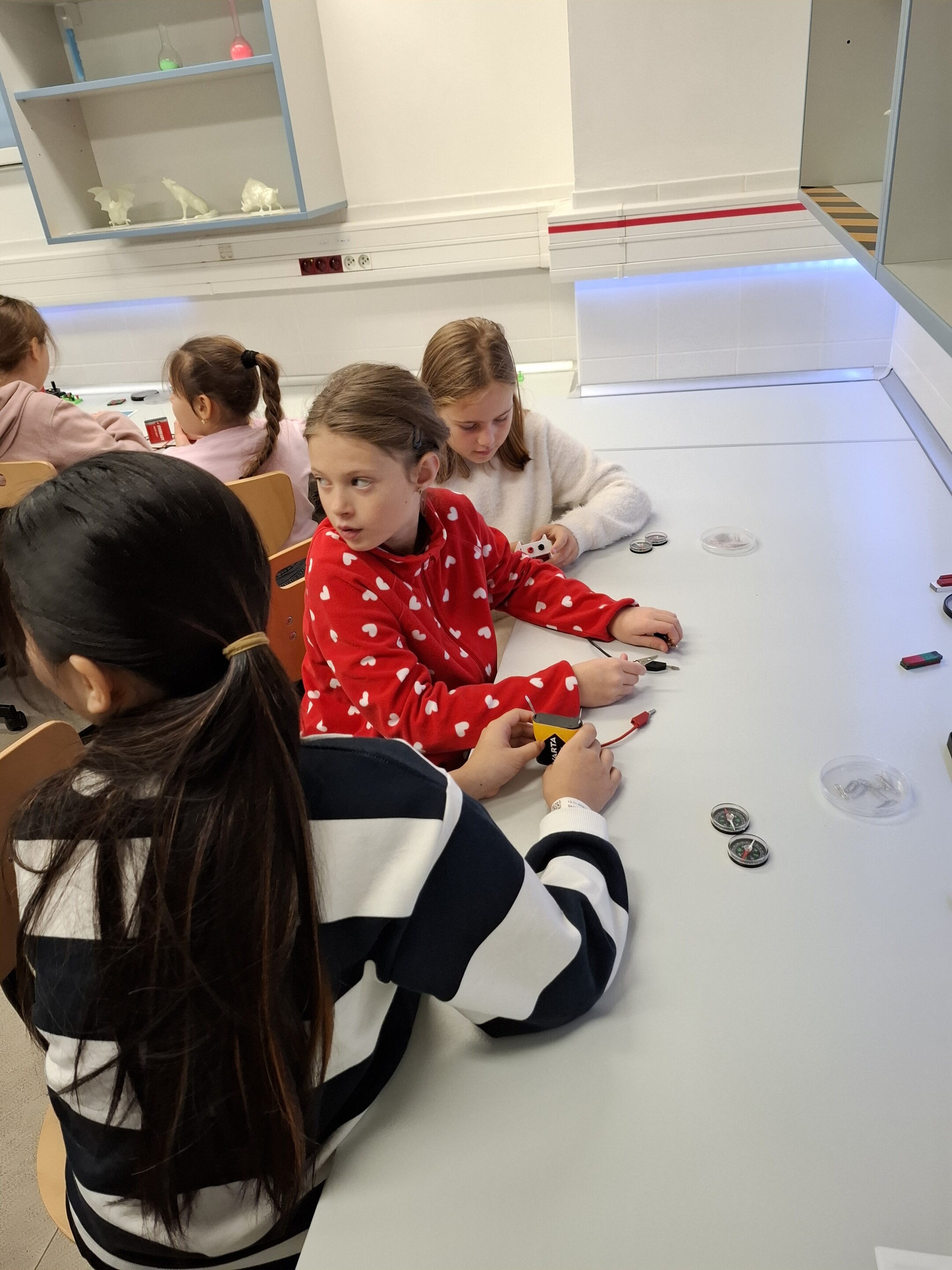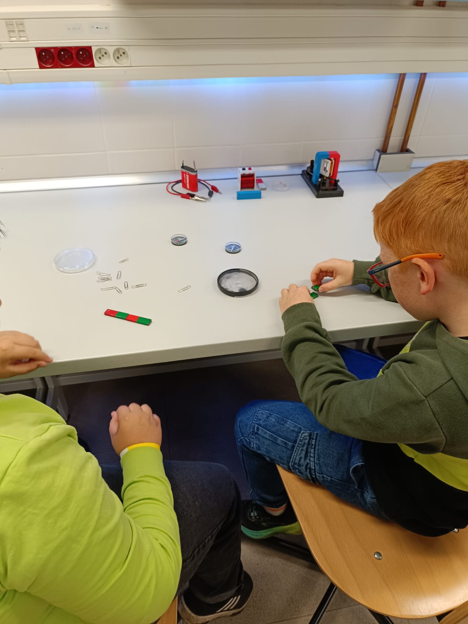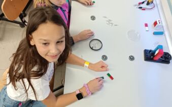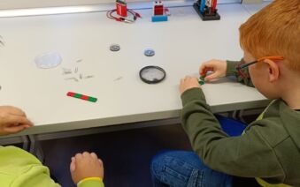 V první části dopoledne se žáci přesunuli do fyzikální dílny. Tam si prostřednictvím jednoduchých, avšak velmi poutavých pokusů vyzkoušeli, jak magnety reagují samy na sebe, jak magnet přitahuje různé předměty, jak magnet ovlivňuje kompas a jak lze vytvořit magnetické pole pomocí cívky. Na závěr se jim podařilo vlastními silami rozsvítit diody.