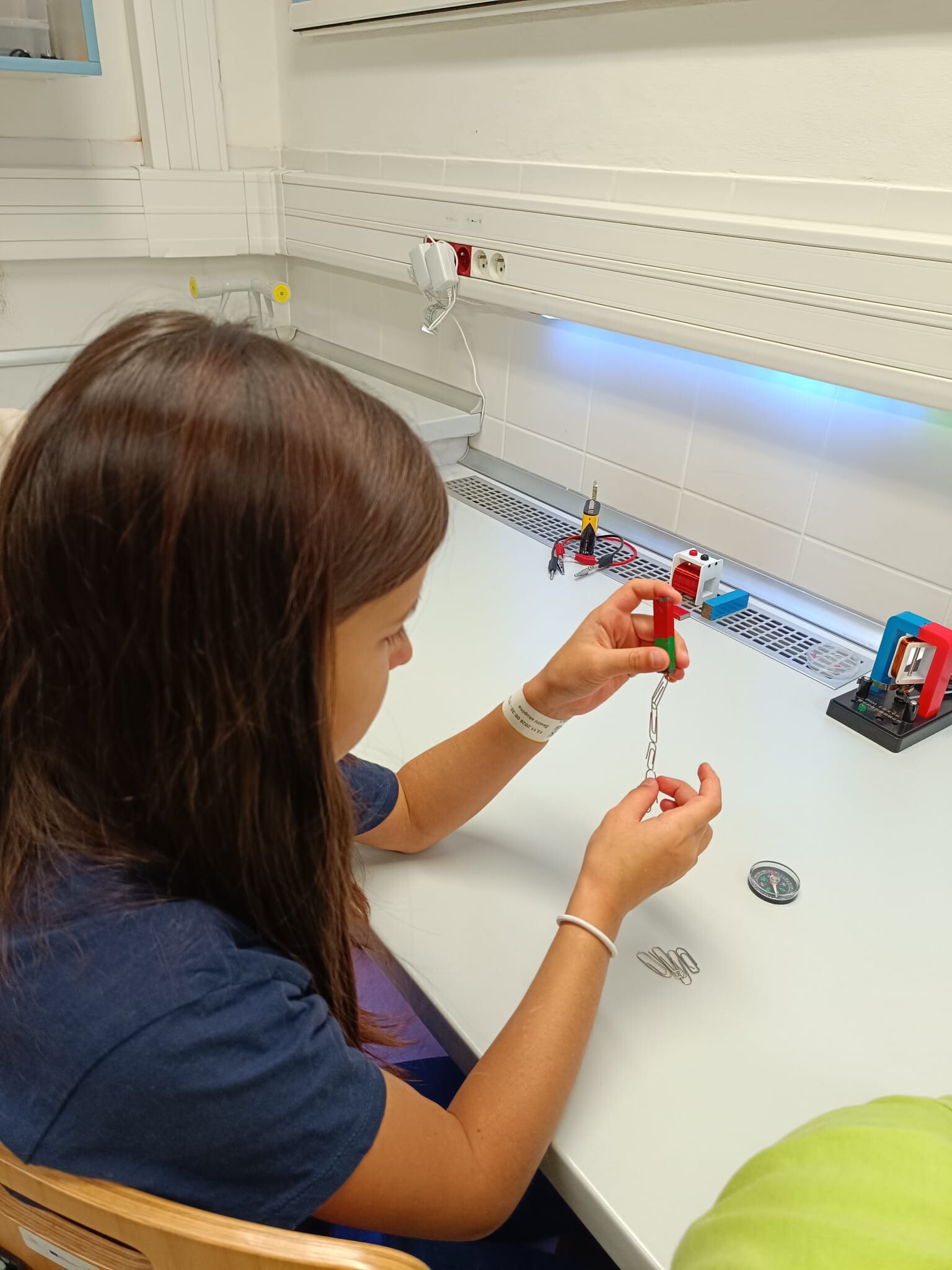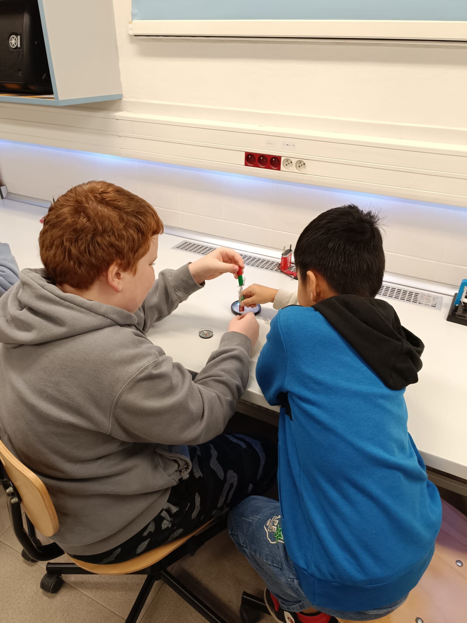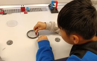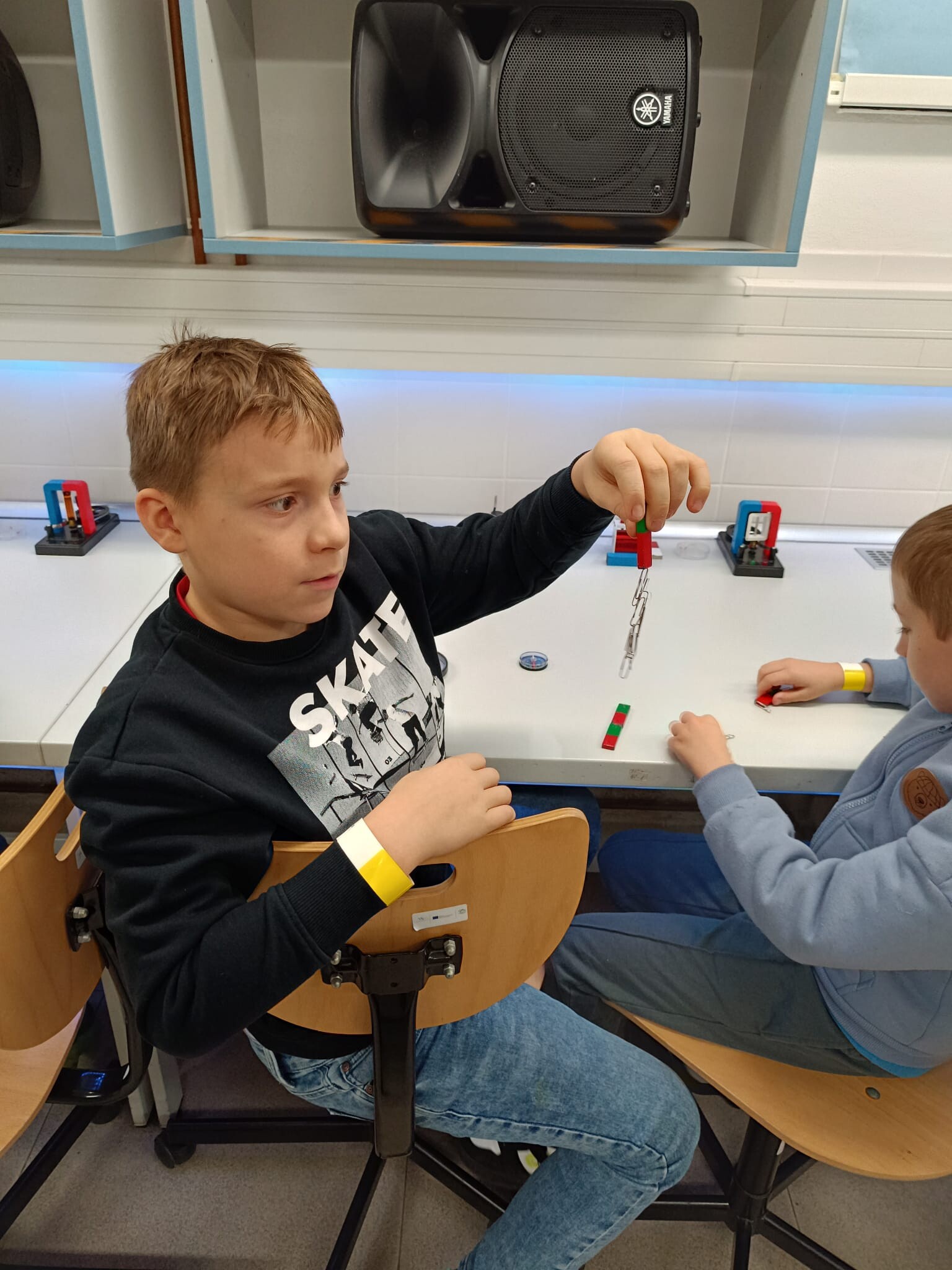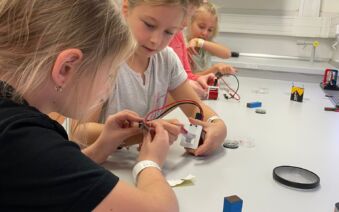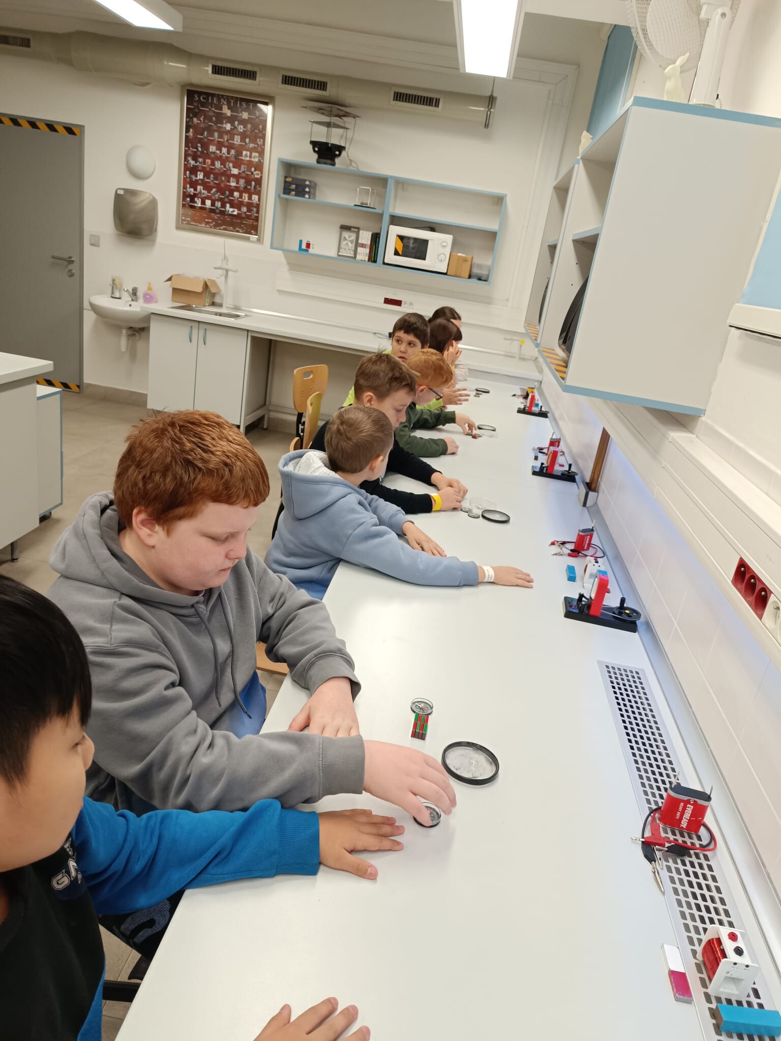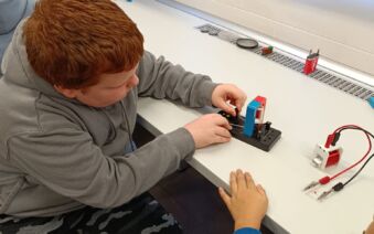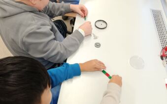 V první části dopoledne se žáci přesunuli do fyzikální dílny. Tam si prostřednictvím jednoduchých, avšak velmi poutavých pokusů vyzkoušeli, jak magnety reagují samy na sebe, jak magnet přitahuje různé předměty, jak magnet ovlivňuje kompas a jak lze vytvořit magnetické pole pomocí cívky. Na závěr se jim podařilo vlastními silami rozsvítit diody.