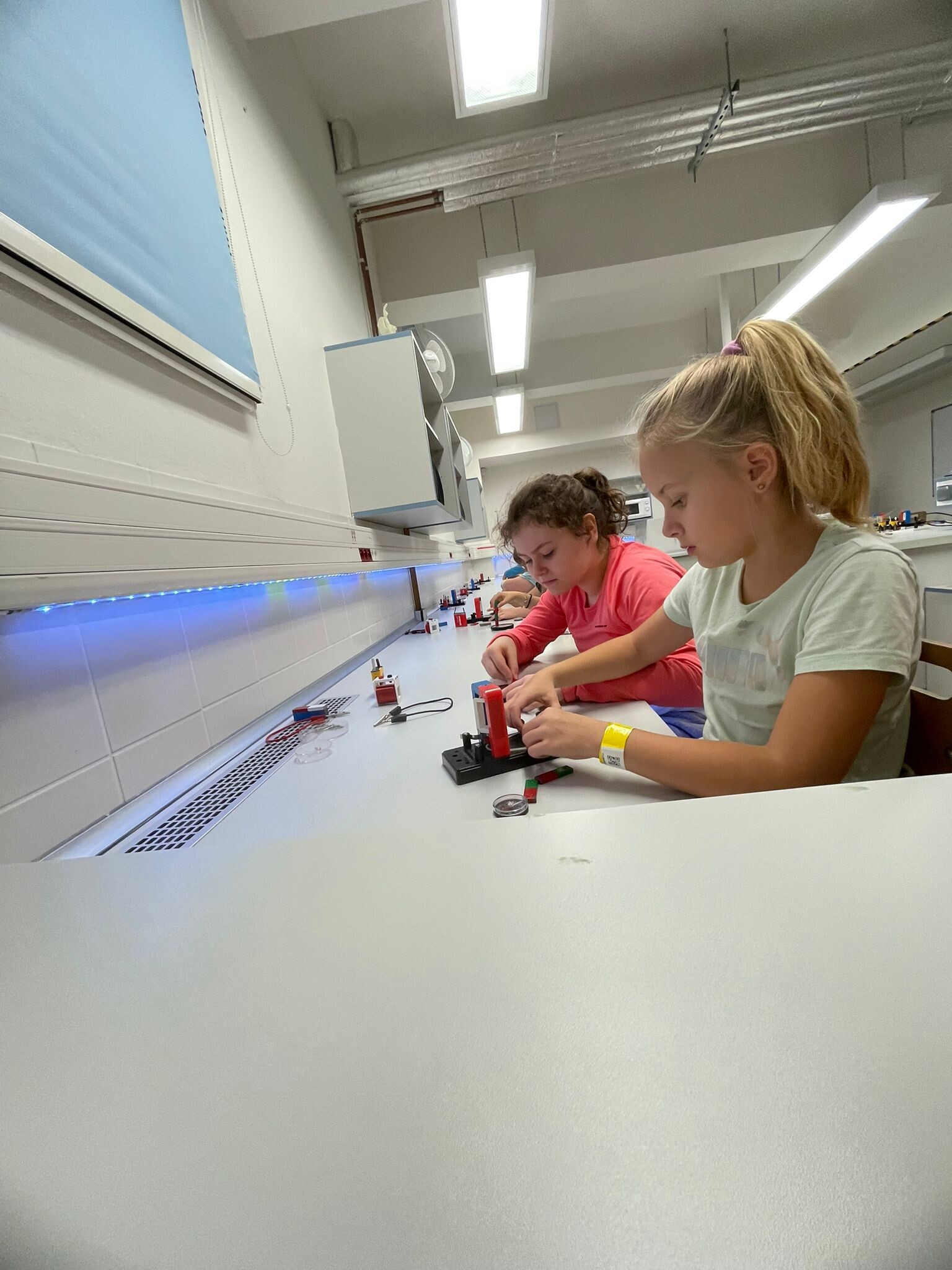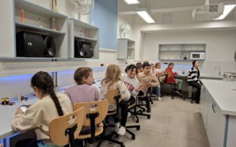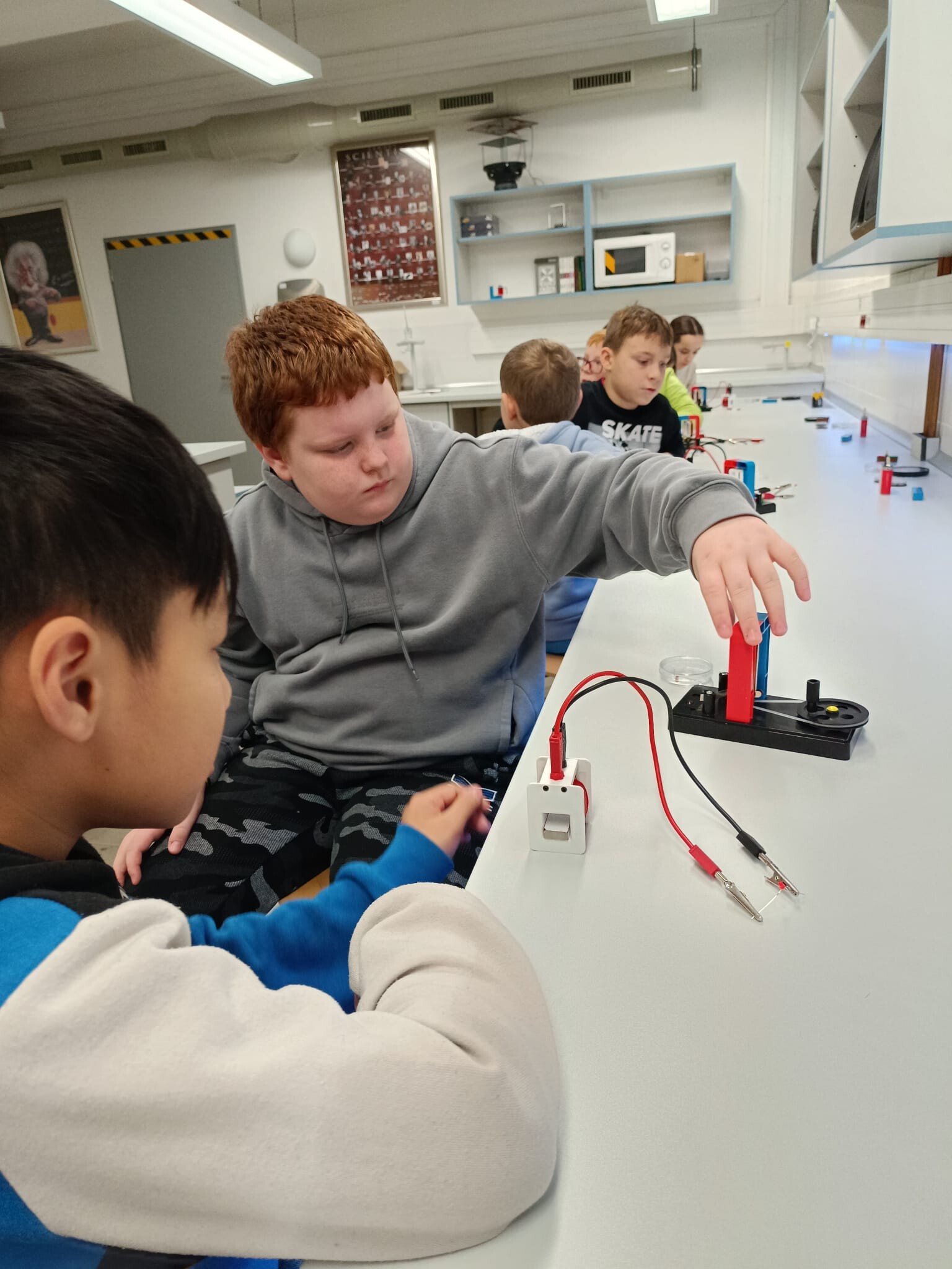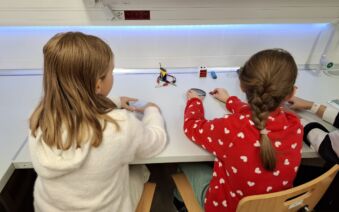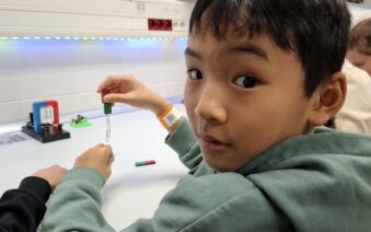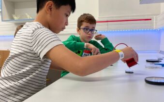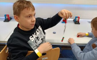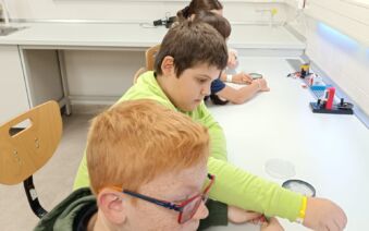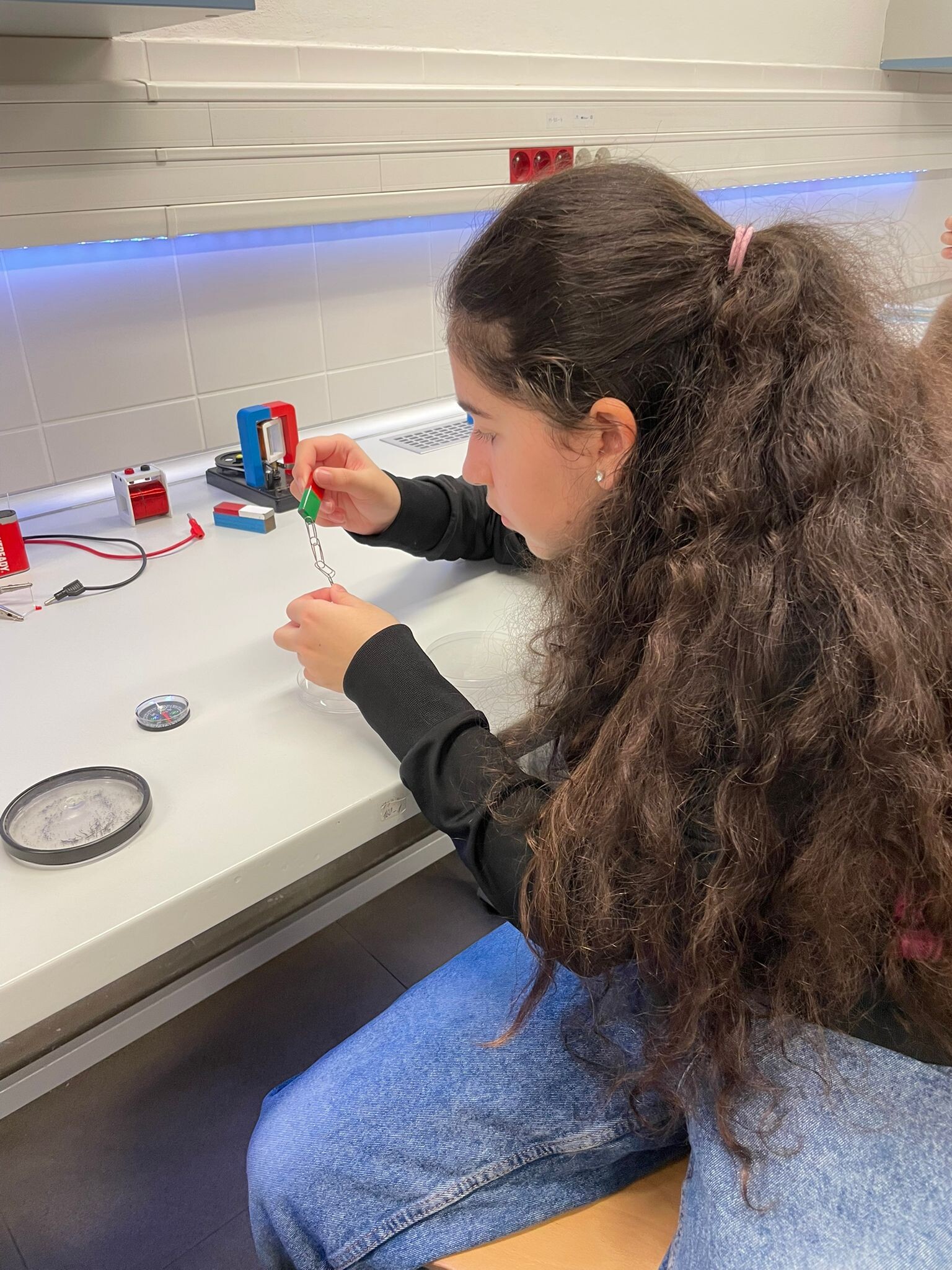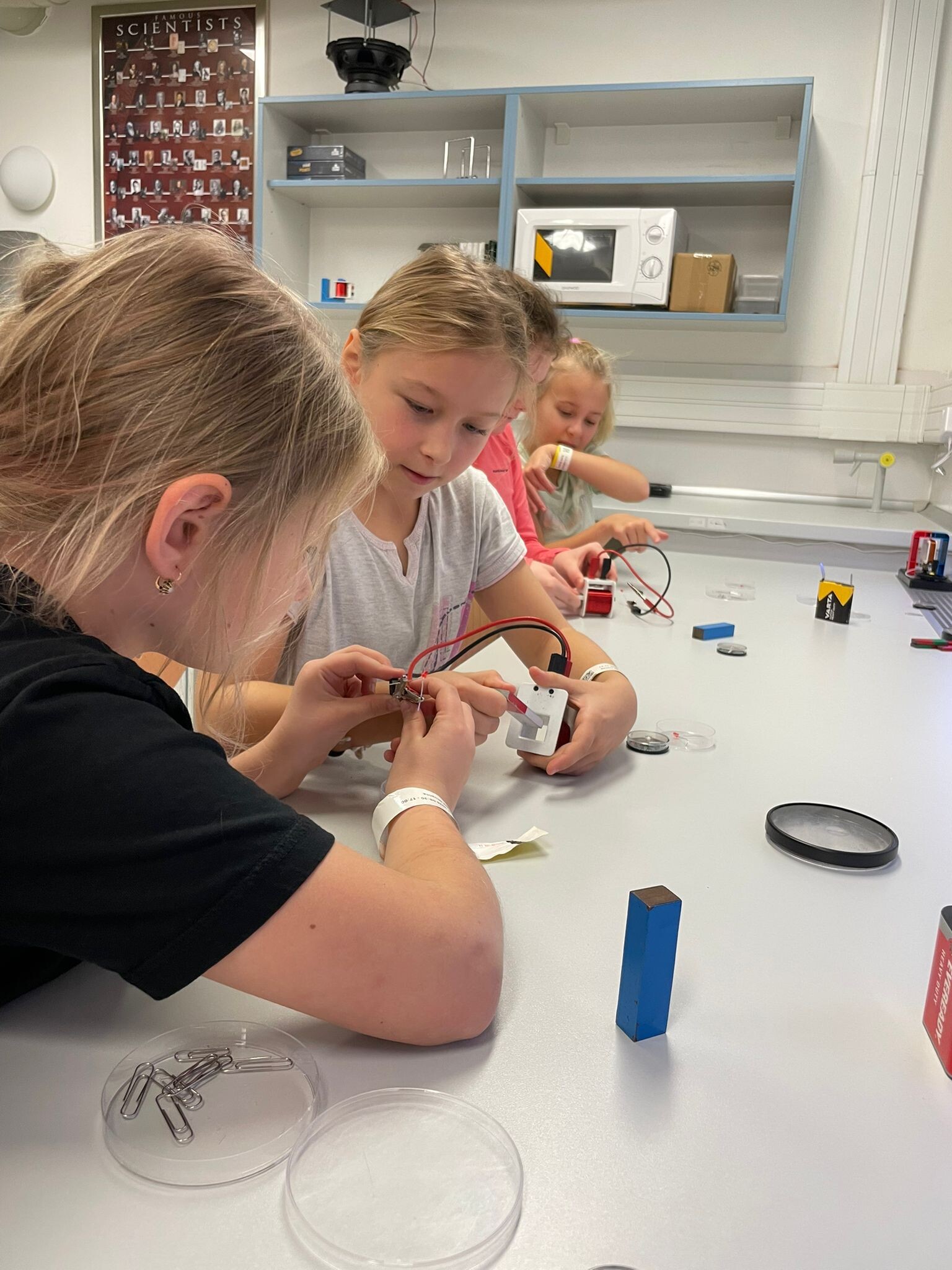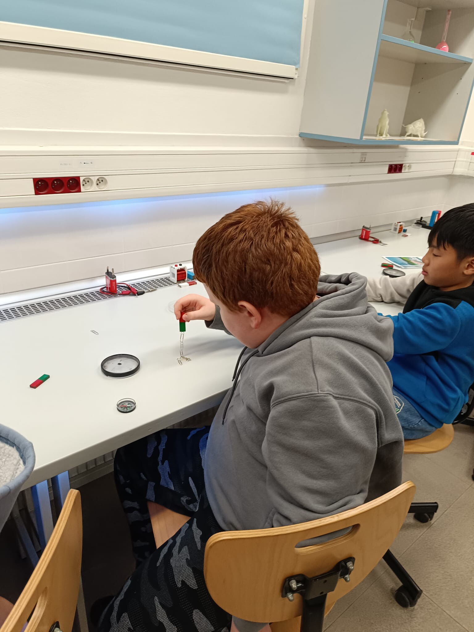 V první části dopoledne se žáci přesunuli do fyzikální dílny. Tam si prostřednictvím jednoduchých, avšak velmi poutavých pokusů vyzkoušeli, jak magnety reagují samy na sebe, jak magnet přitahuje různé předměty, jak magnet ovlivňuje kompas a jak lze vytvořit magnetické pole pomocí cívky. Na závěr se jim podařilo vlastními silami rozsvítit diody.