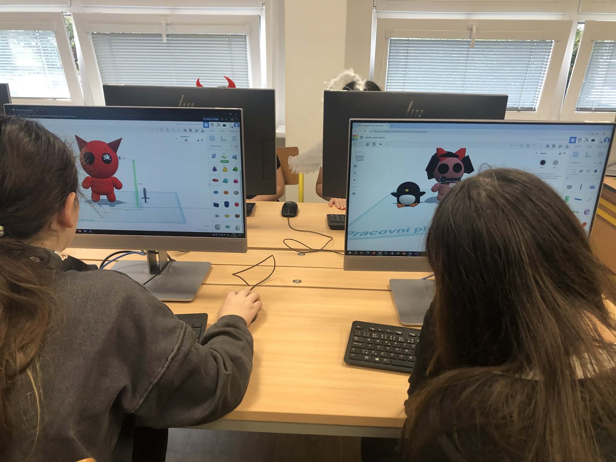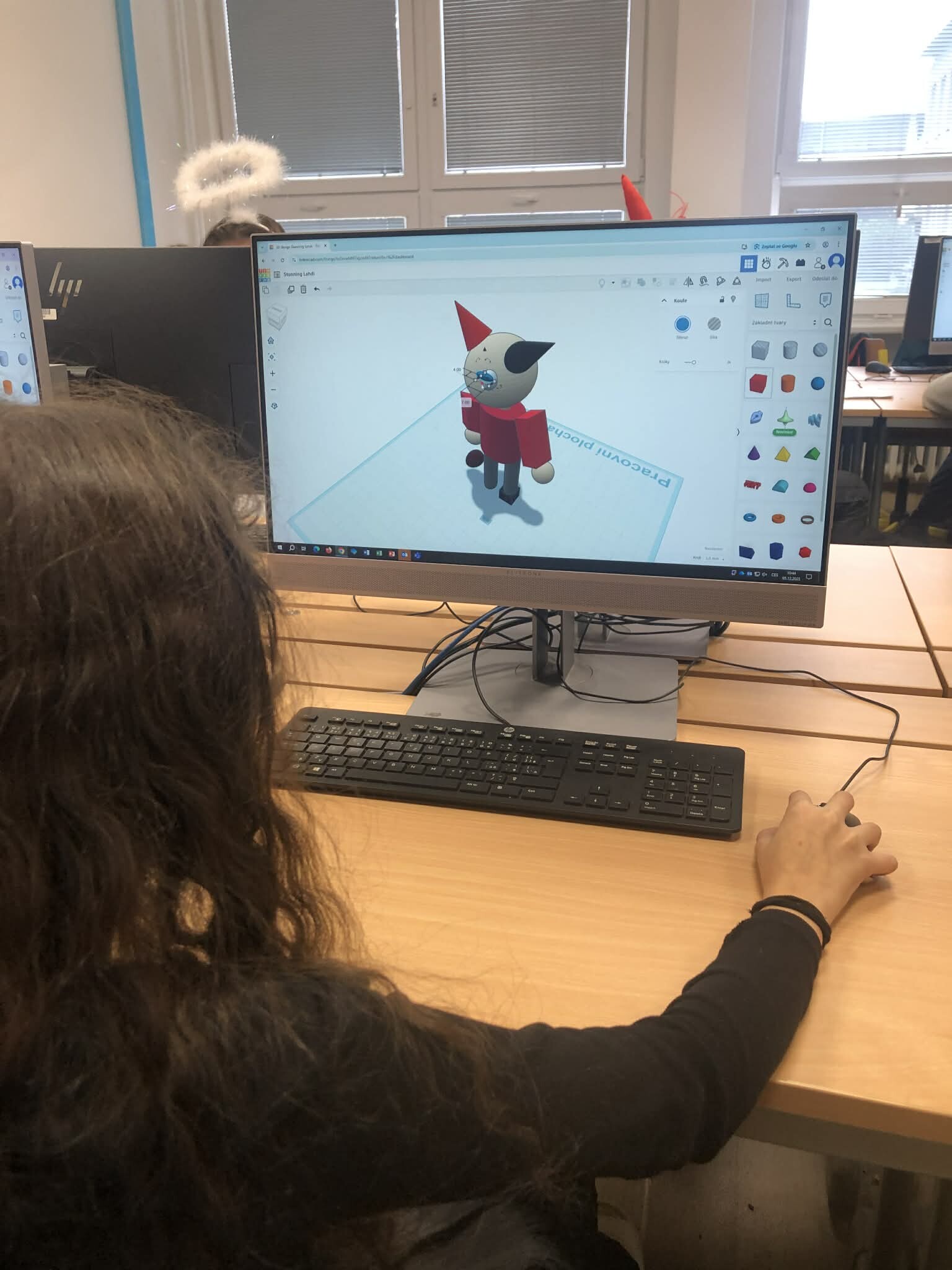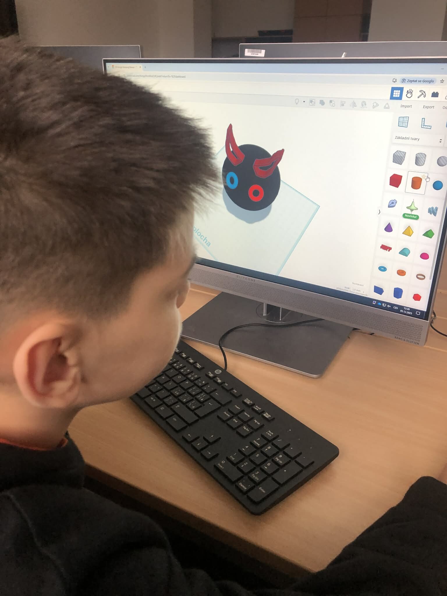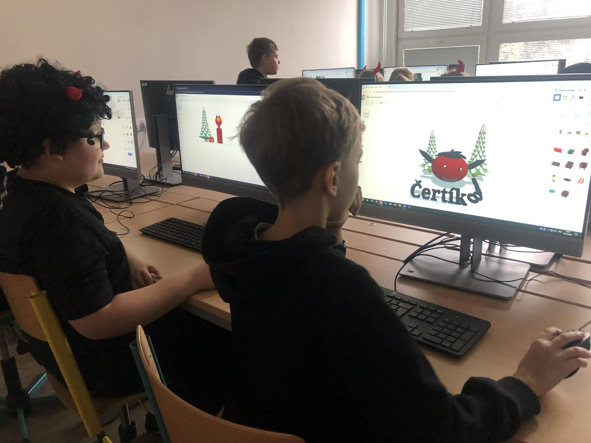 Žáci pátých tříd si vyzkoušeli práci v 3D programu a zároveň jsme tematicky využili den 5.12., kdy do školy obvykle chodí čerti. Úkolem bylo vytvořit vlastního čerta – od základních tvarů až po drobné detaily, jako jsou rohy, řetězy nebo huňaté vlasy.