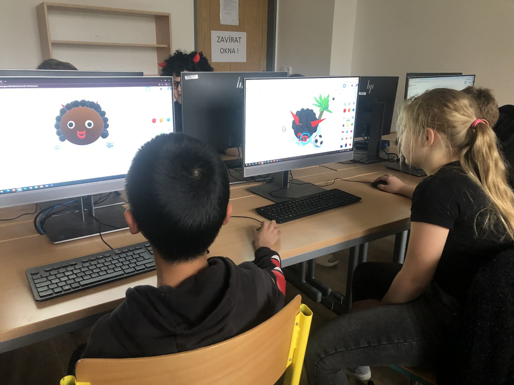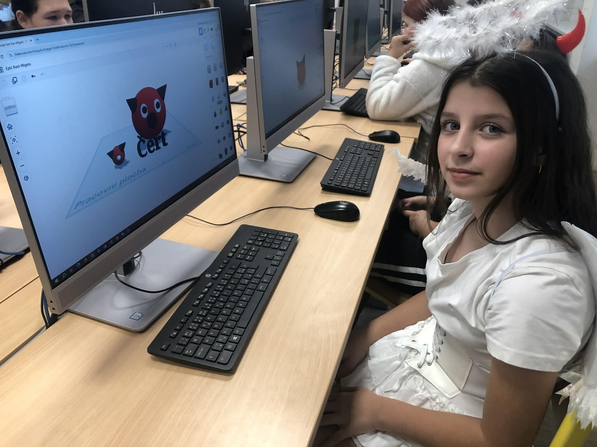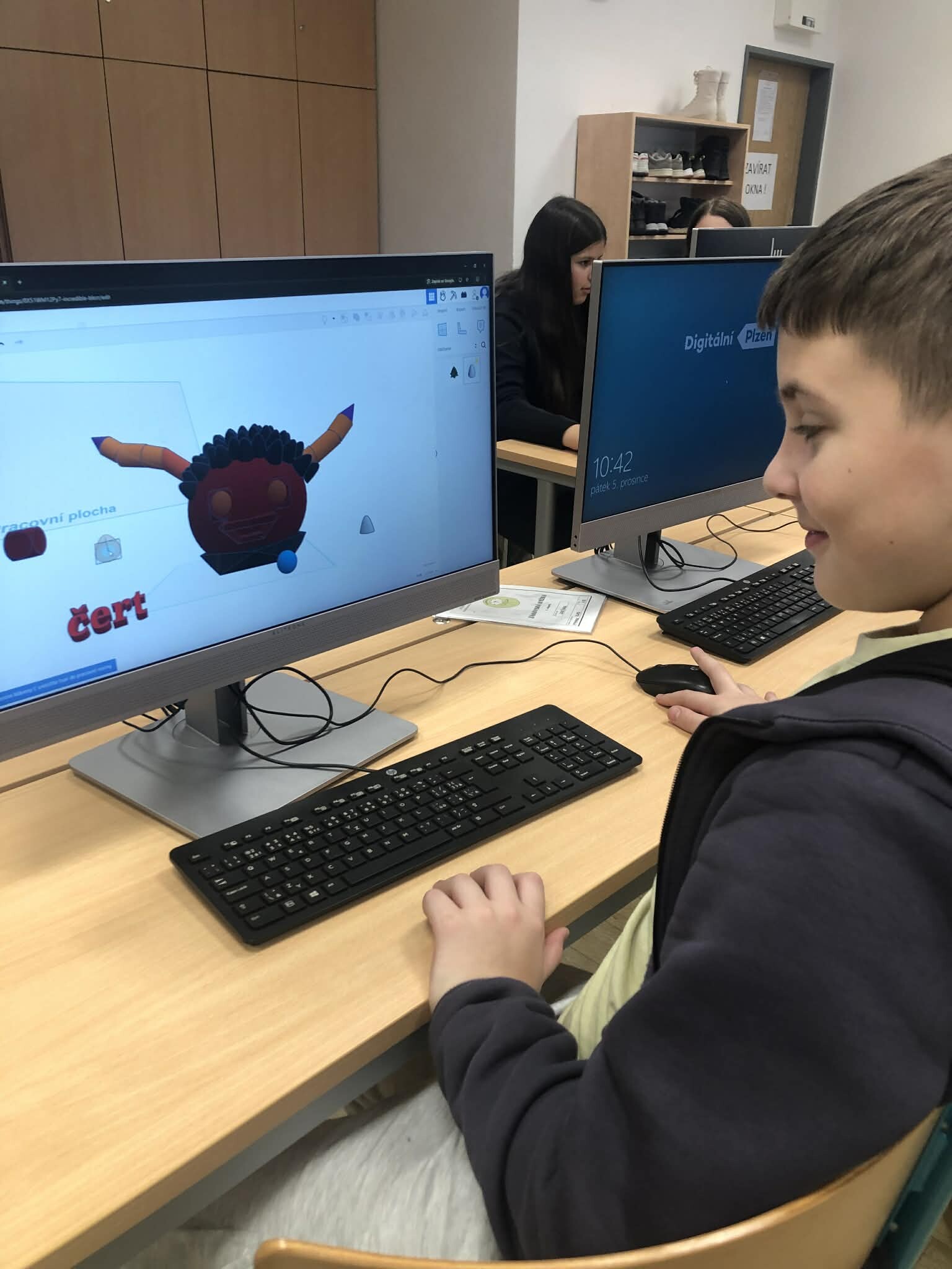 Žáci pátých tříd si vyzkoušeli práci v 3D programu a zároveň jsme tematicky využili den 5.12., kdy do školy obvykle chodí čerti. Úkolem bylo vytvořit vlastního čerta – od základních tvarů až po drobné detaily, jako jsou rohy, řetězy nebo huňaté vlasy.