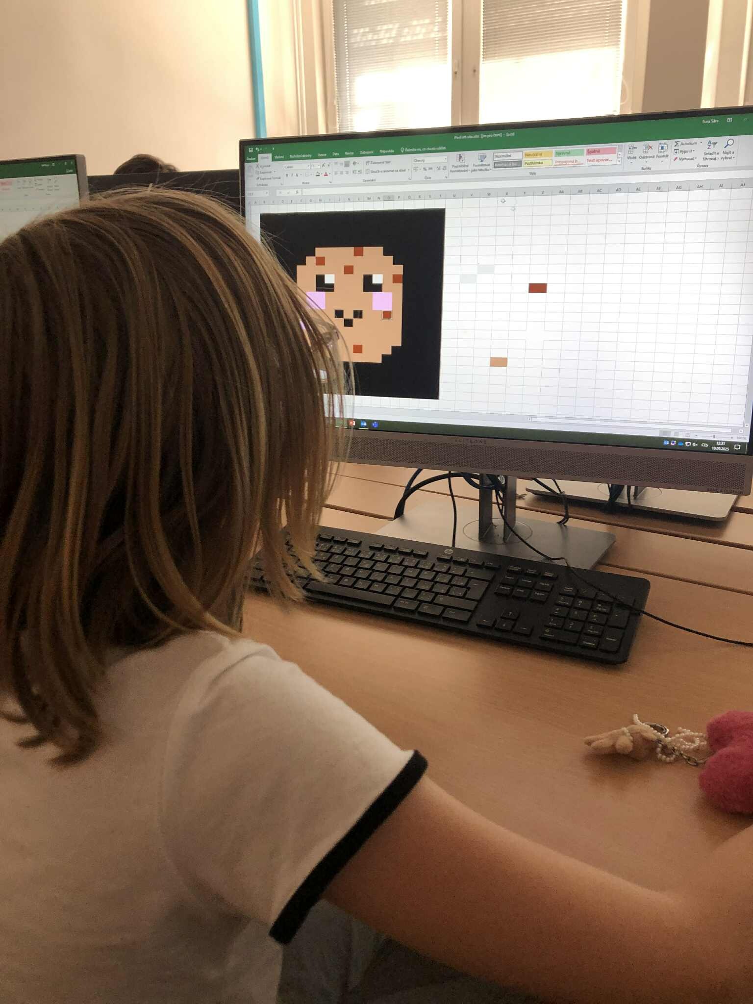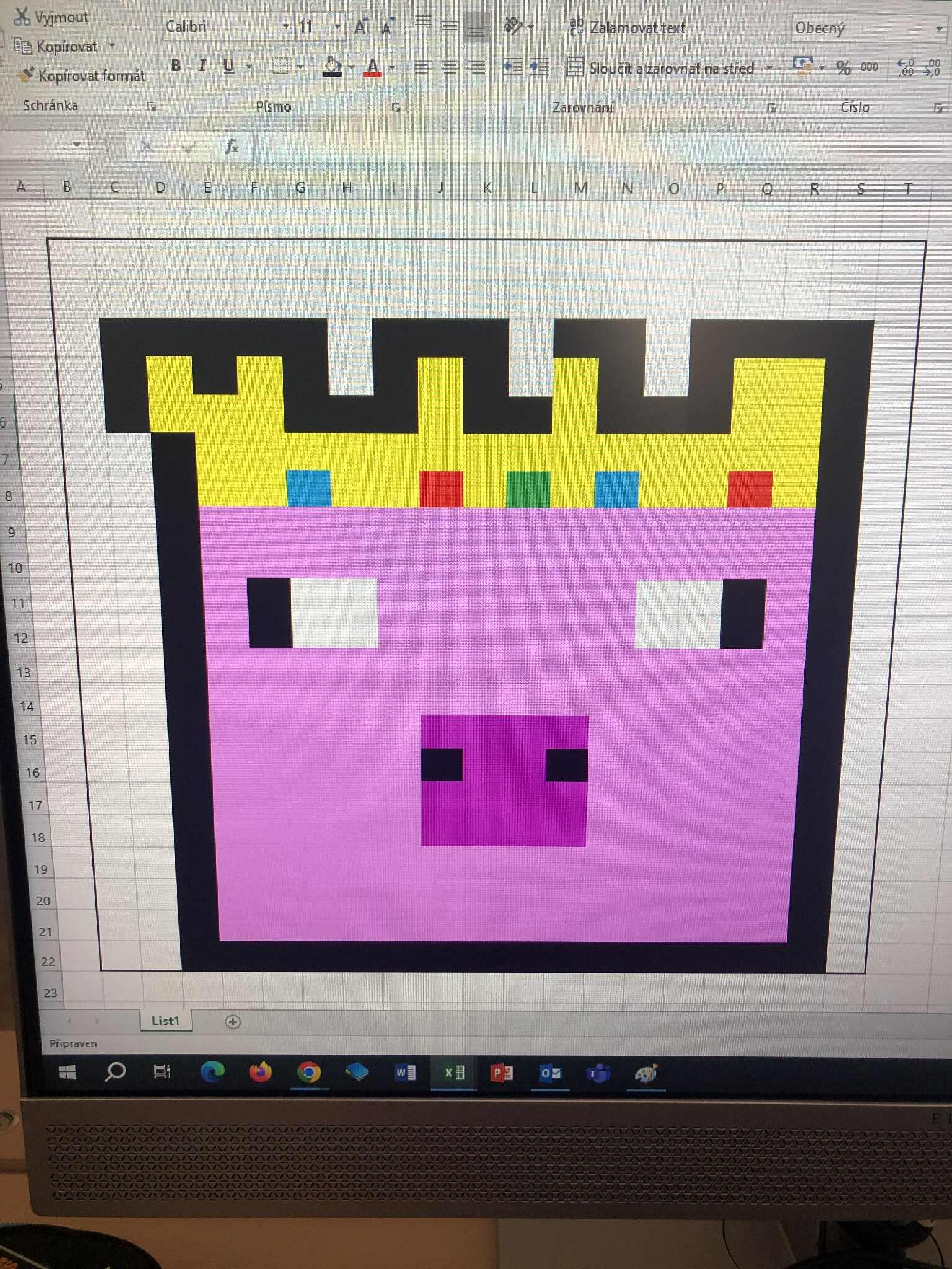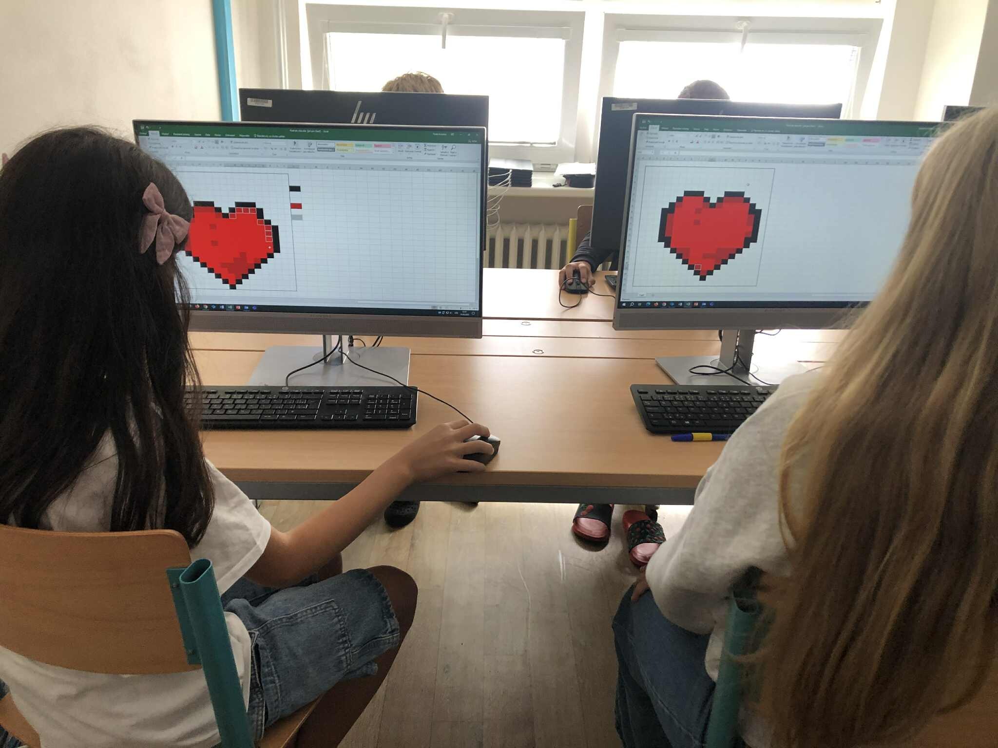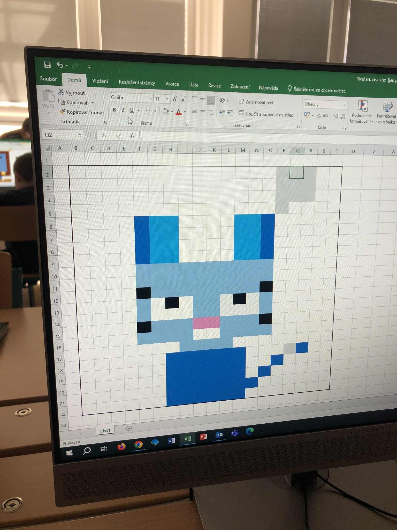 Místo speciálního grafického programu děti tentokrát využily tabulkový procesor Excel. V něm zmenšily buňky na drobné čtverečky, které pak vybarvovaly. Z jednotlivých barevných „pixelů“ tak postupně vznikaly různé obrázky – od jednoduchých symbolů až po propracovanější motivy.
