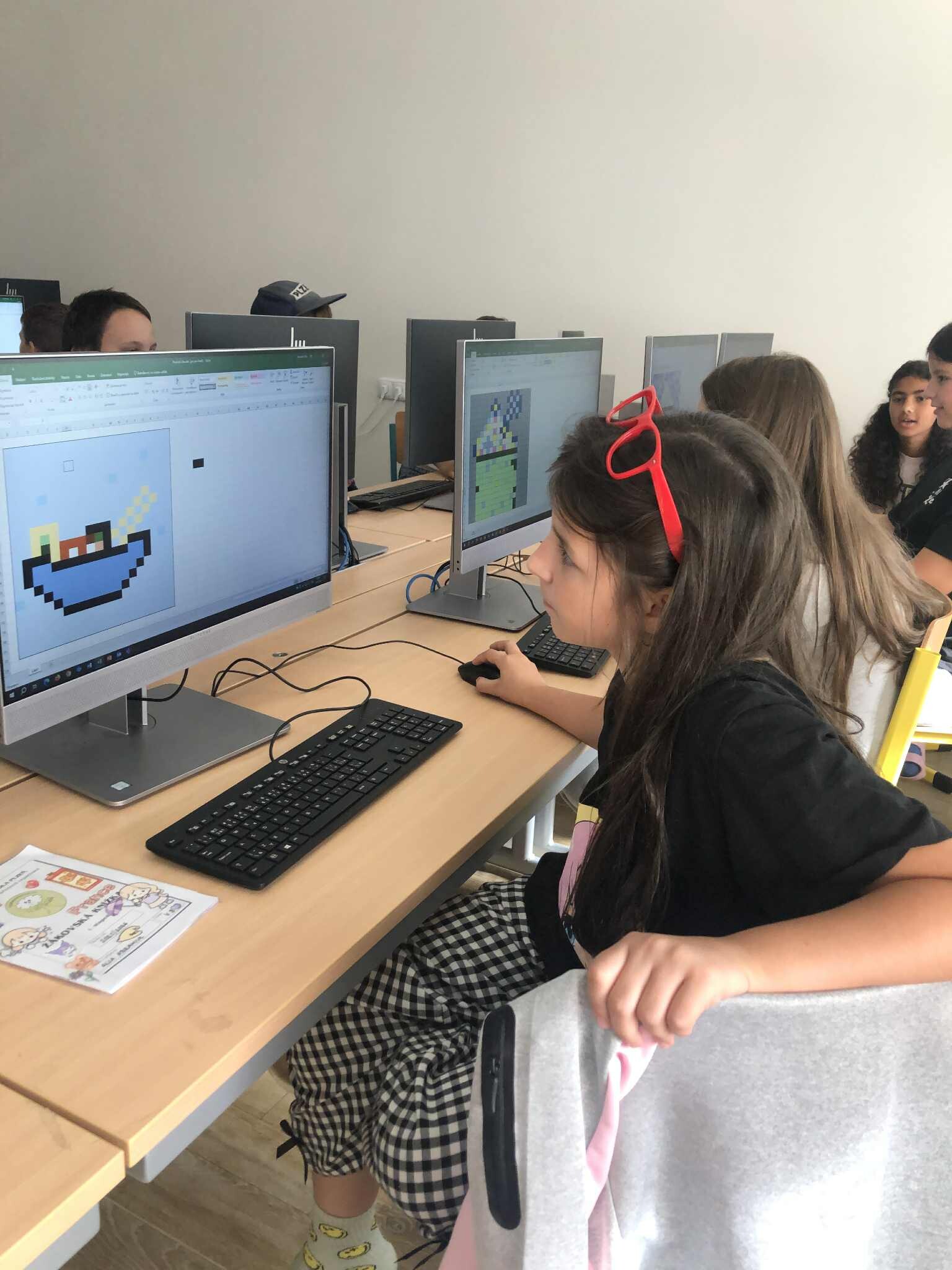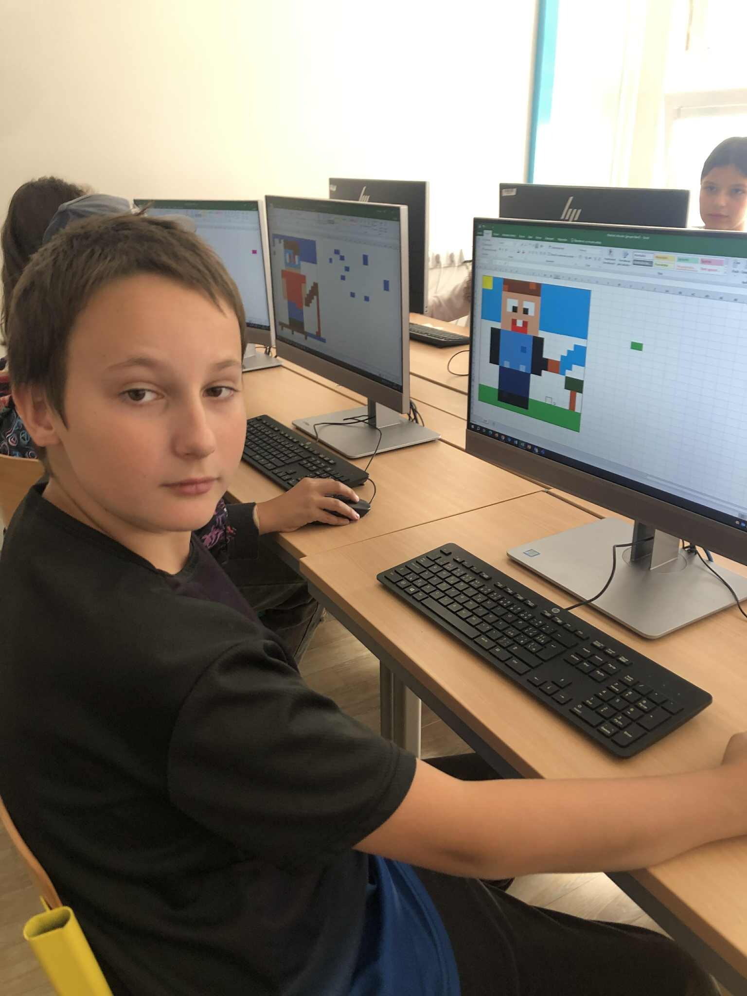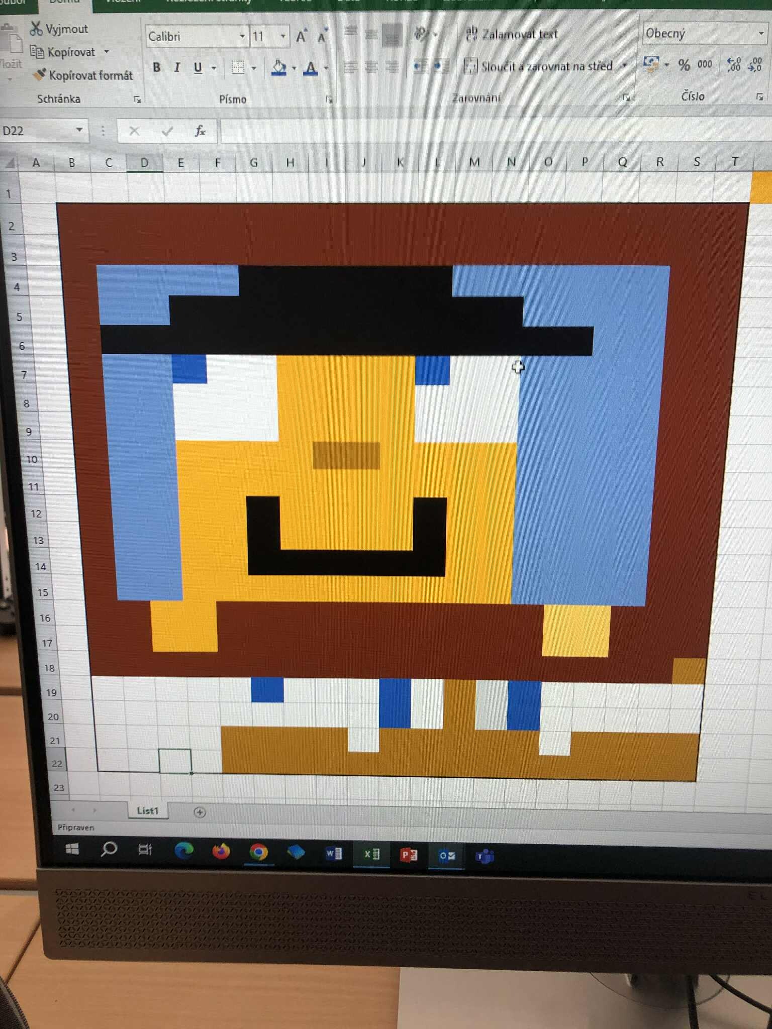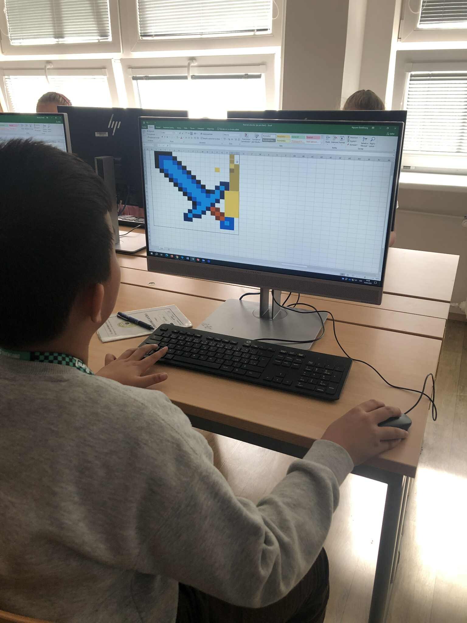 Místo speciálního grafického programu děti tentokrát využily tabulkový procesor Excel. V něm zmenšily buňky na drobné čtverečky, které pak vybarvovaly. Z jednotlivých barevných „pixelů“ tak postupně vznikaly různé obrázky – od jednoduchých symbolů až po propracovanější motivy.