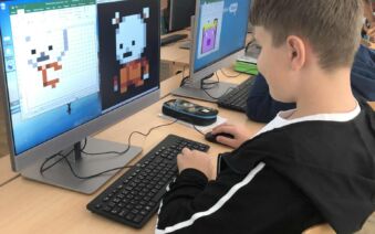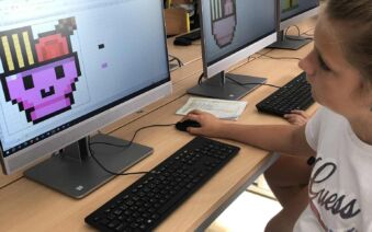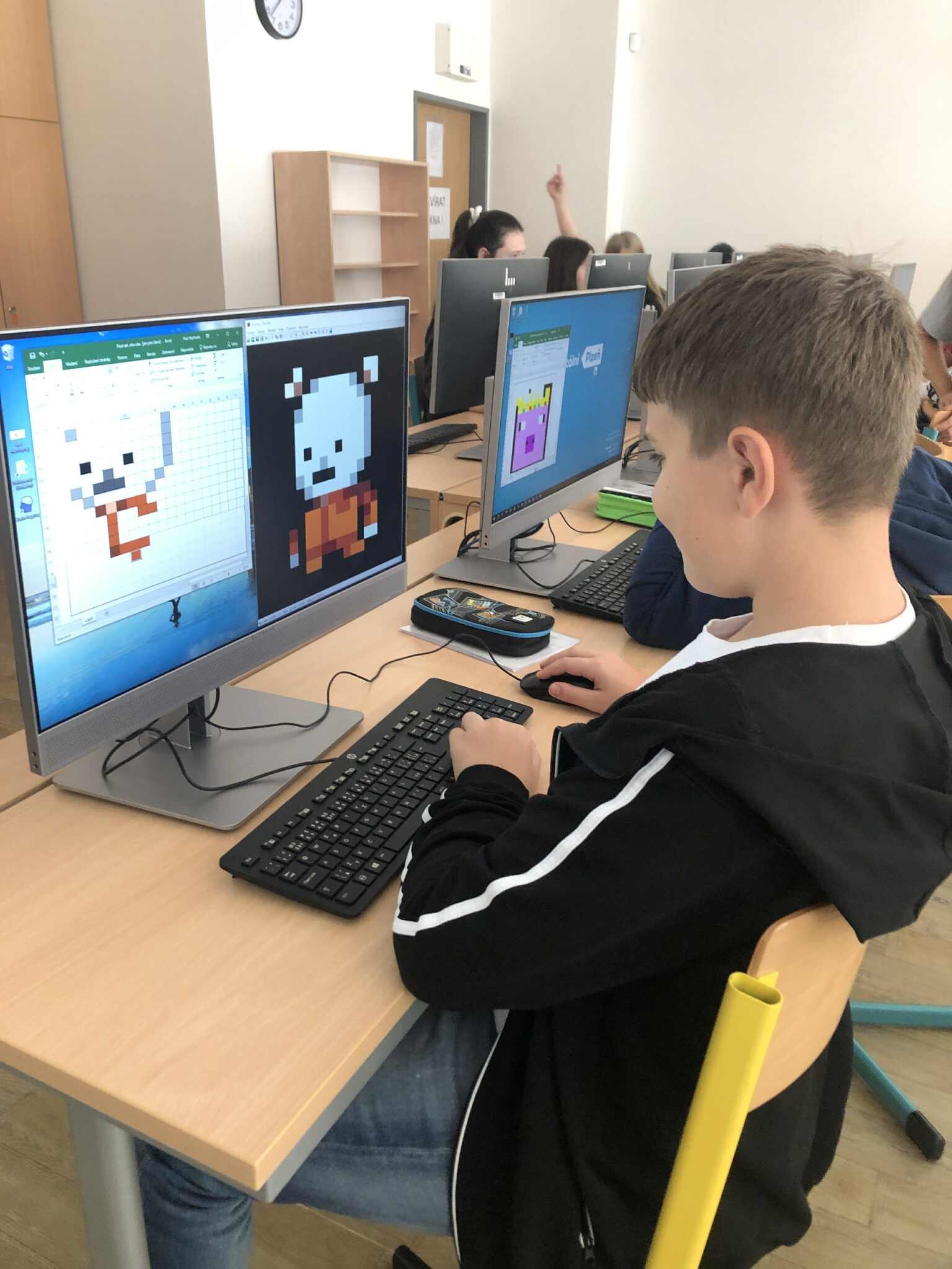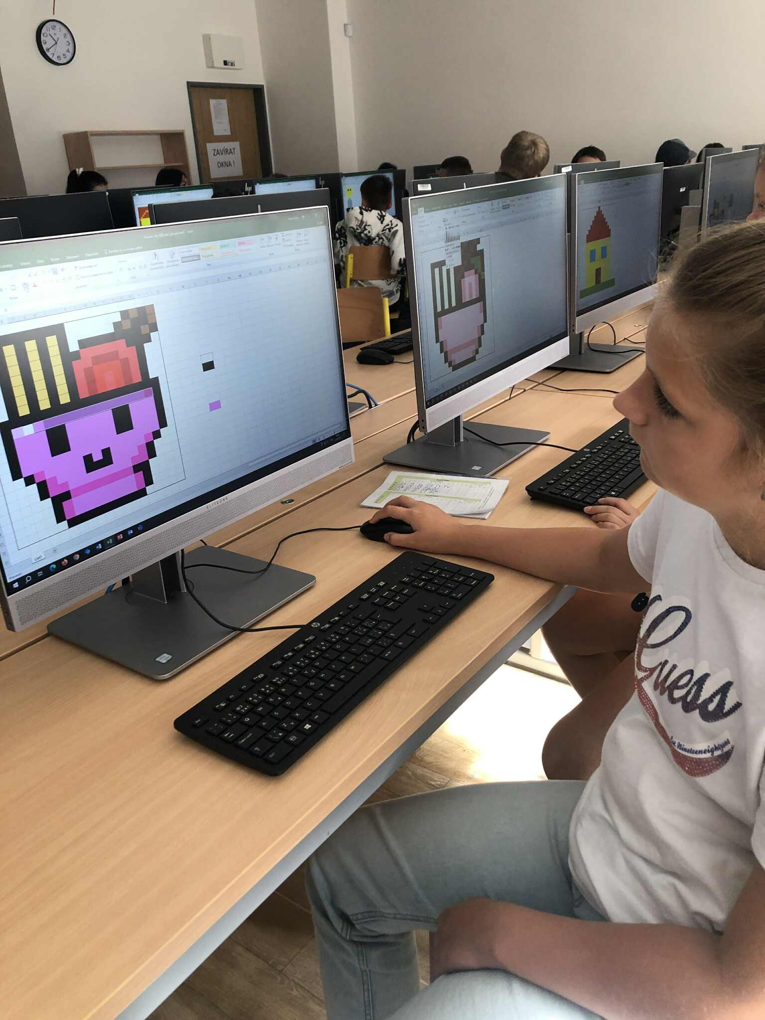 Žáci pátých ročníků si v hodinách informatiky vyzkoušeli netradiční způsob tvoření – pixel art. Tento pojem označuje styl digitální grafiky, kdy se obrázky skládají z jednotlivých malých čtverečků – pixelů. Pixel art připomíná staré počítačové hry a je založený na jednoduchosti a barevné hravosti.