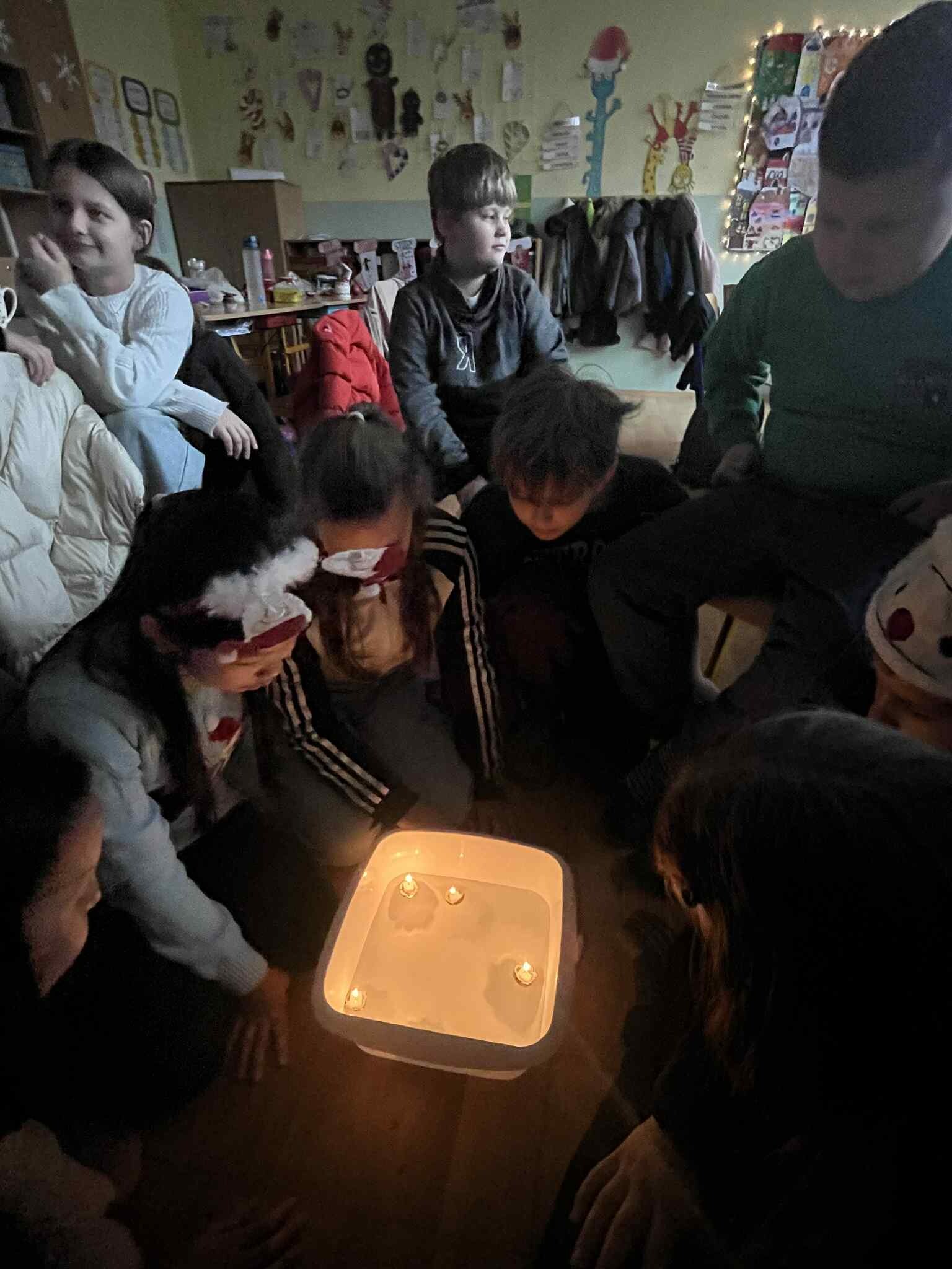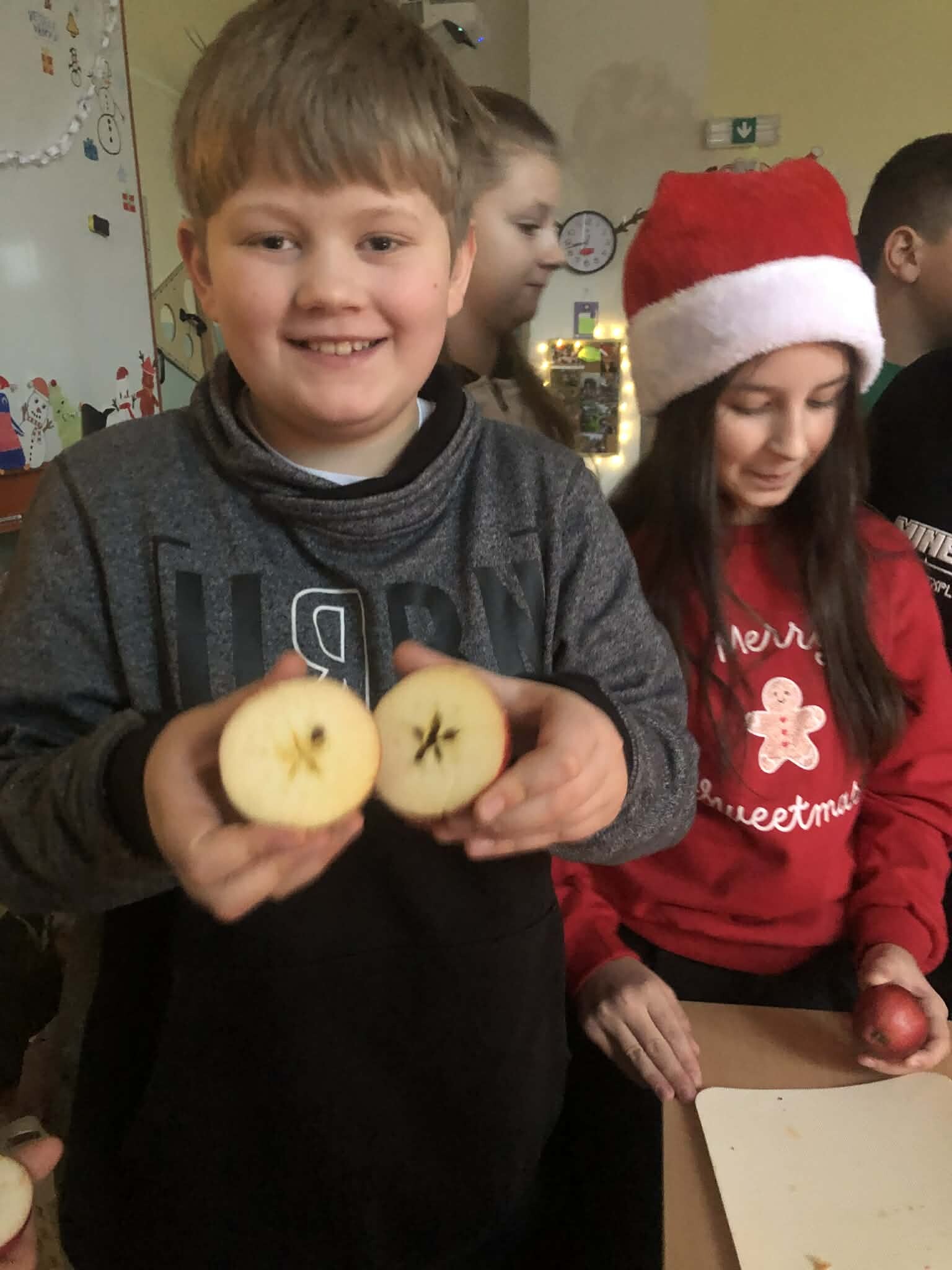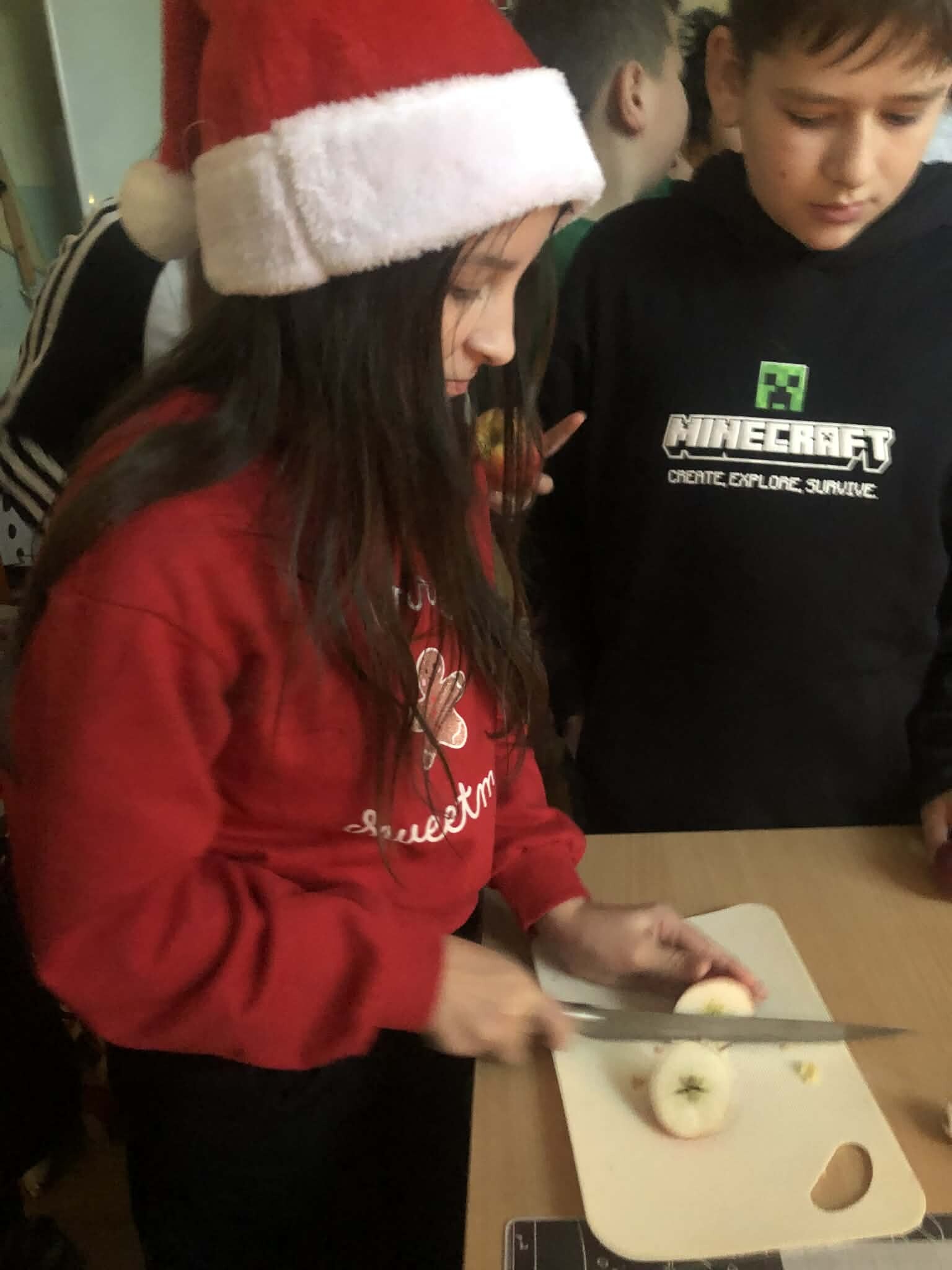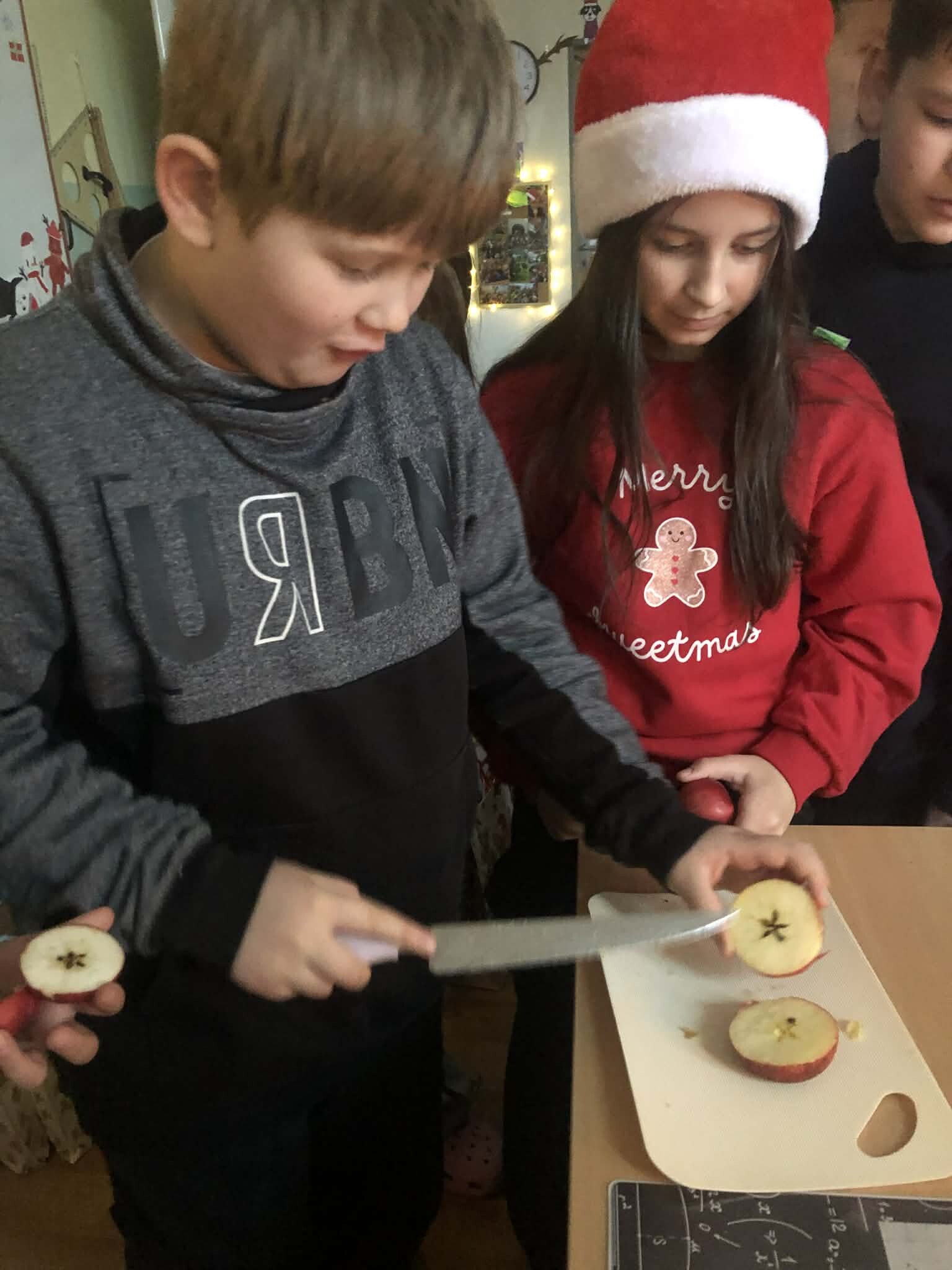 Následně jsme si vyzkoušeli některé vánoční tradice. Krájeli jsme jablíčka – a velkou radost nám udělalo, že se všem objevily krásné hvězdičky. Pouštěli jsme také lodičky a se zaujetím sledovali, jak se na vodě chovají a kam poplují.