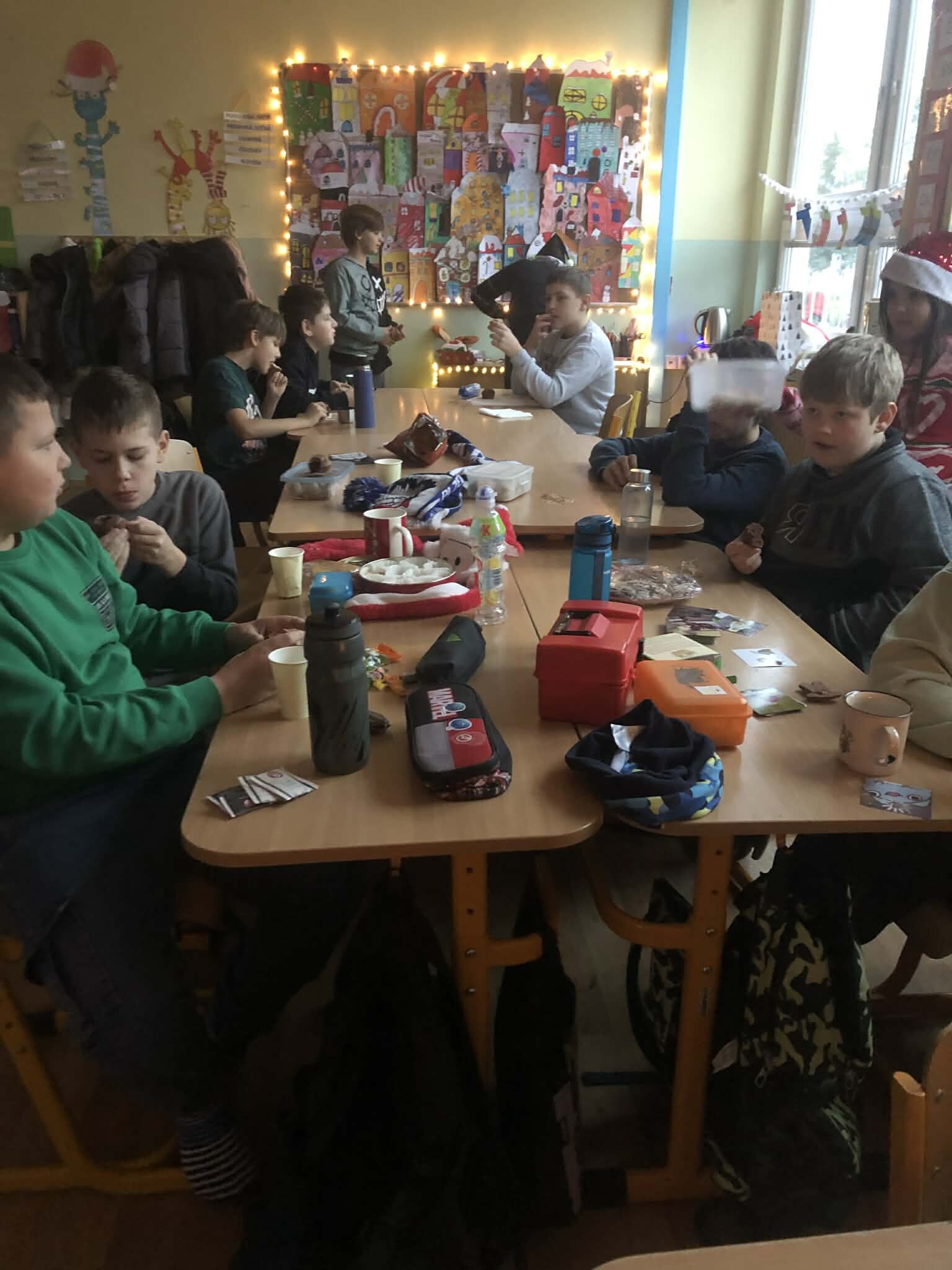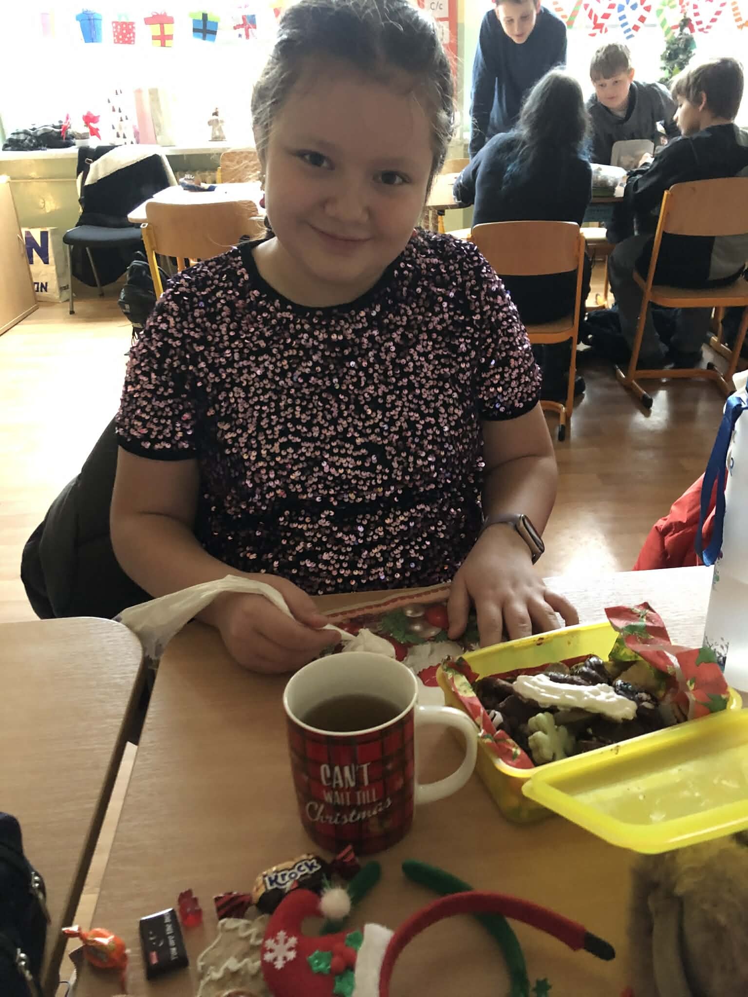 Vánoční besídku jsme zahájili společnou snídaní. Děti přinesly cukroví, které doma samy pekly, a tak jsme mohli ochutnat spoustu dobrot. Připravili jsme si také čaj a pochutnali si na domácích muffinech s perníčkem, které pro děti s láskou upekla paní asistentka.