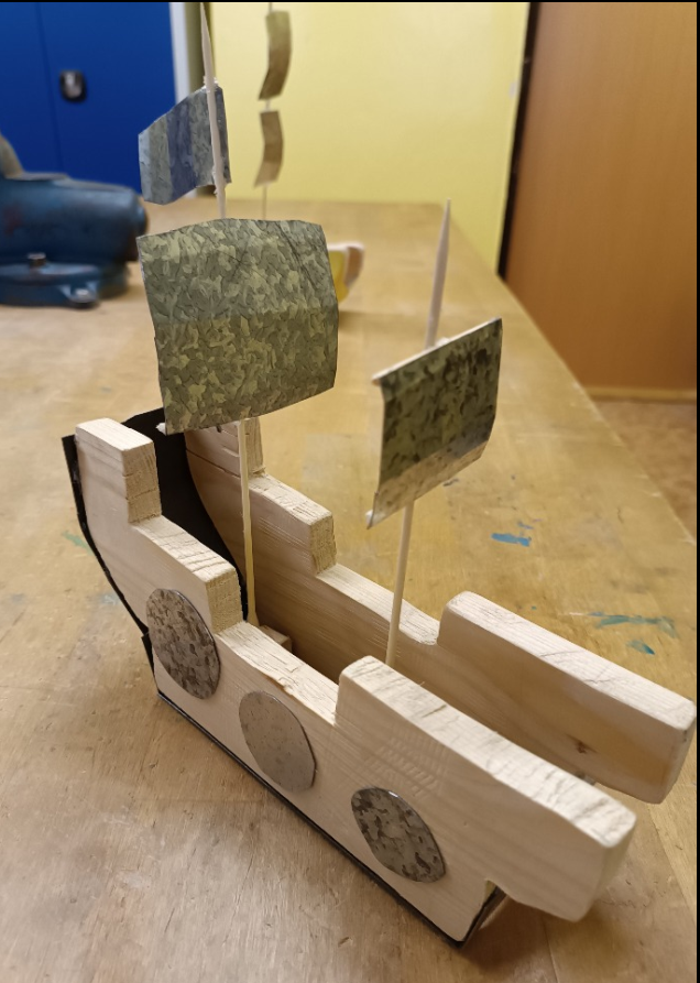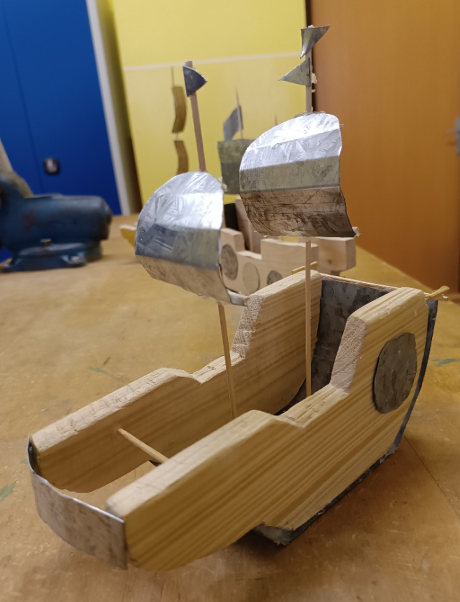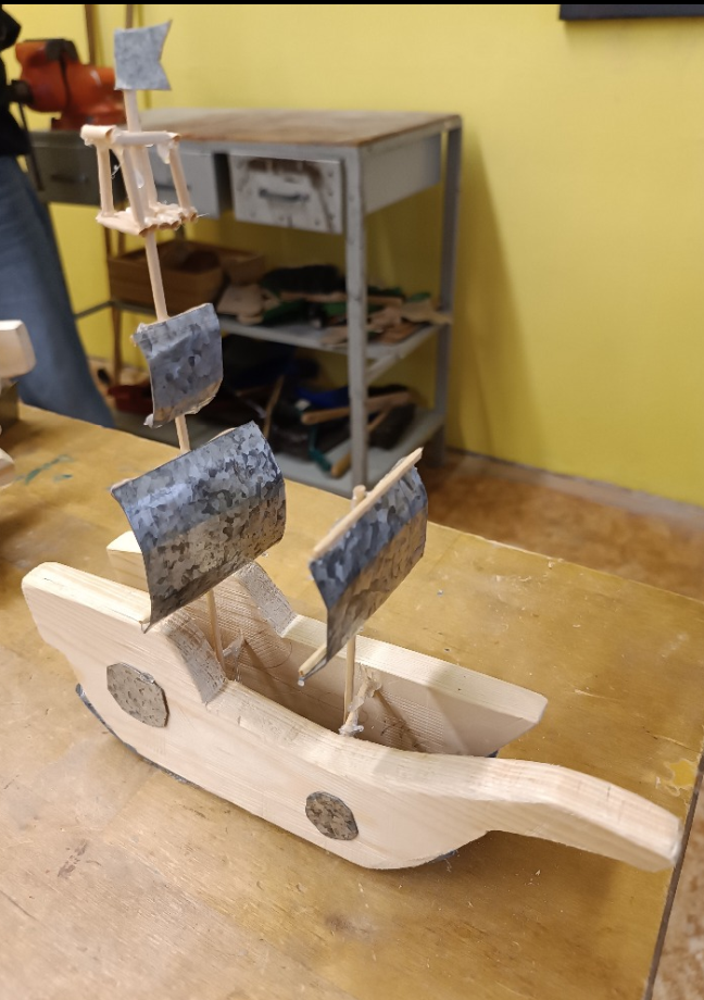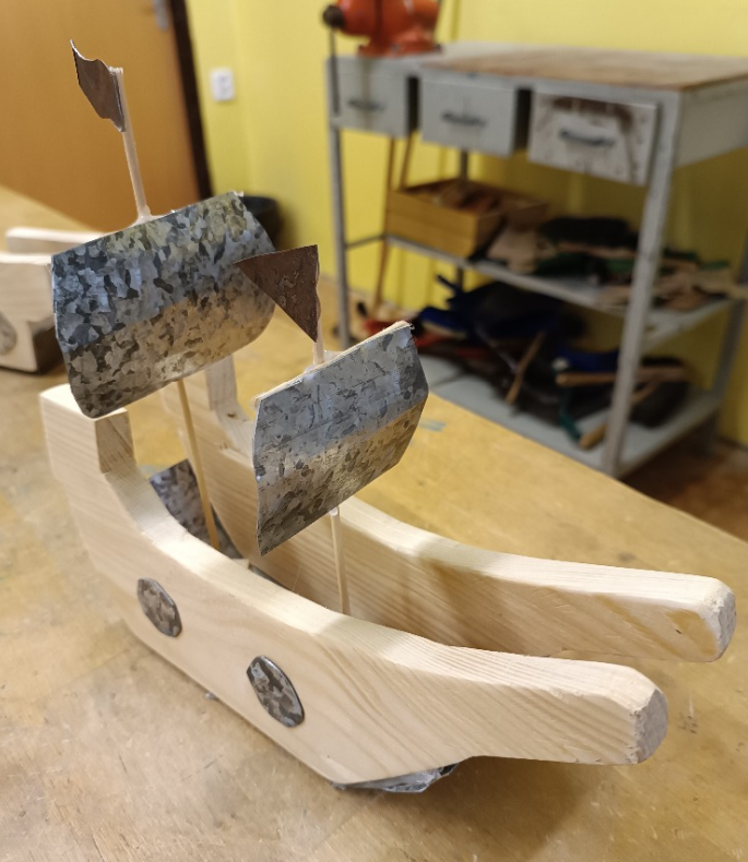 Další částí výrobku byly plachty z plechu. Ty si žáci vystřihli nůžkami na plech a poté je ohnuli tak, aby vypadaly, jako by loď právě plula ve větru. Práce s kovem vyžadovala opatrnost i cit pro tvar – a deváťáci to zvládli výborně.