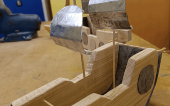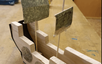Plachty žáci připevnili na stožár, který upevnili doprostřed trupu. Nezapomněli ani na drobné detaily – například střílny, které opět vystřihli z plechu a umístili po bocích lodi.
