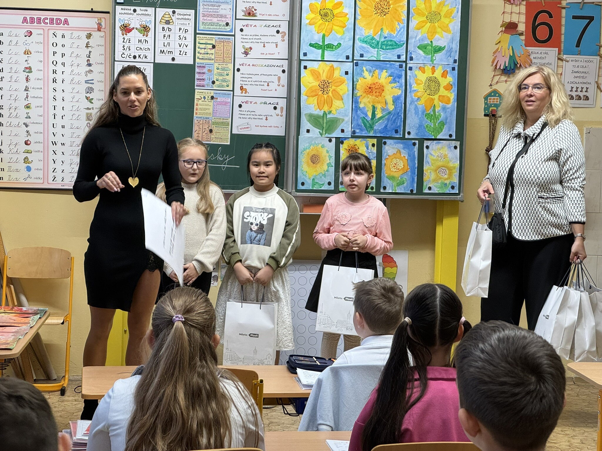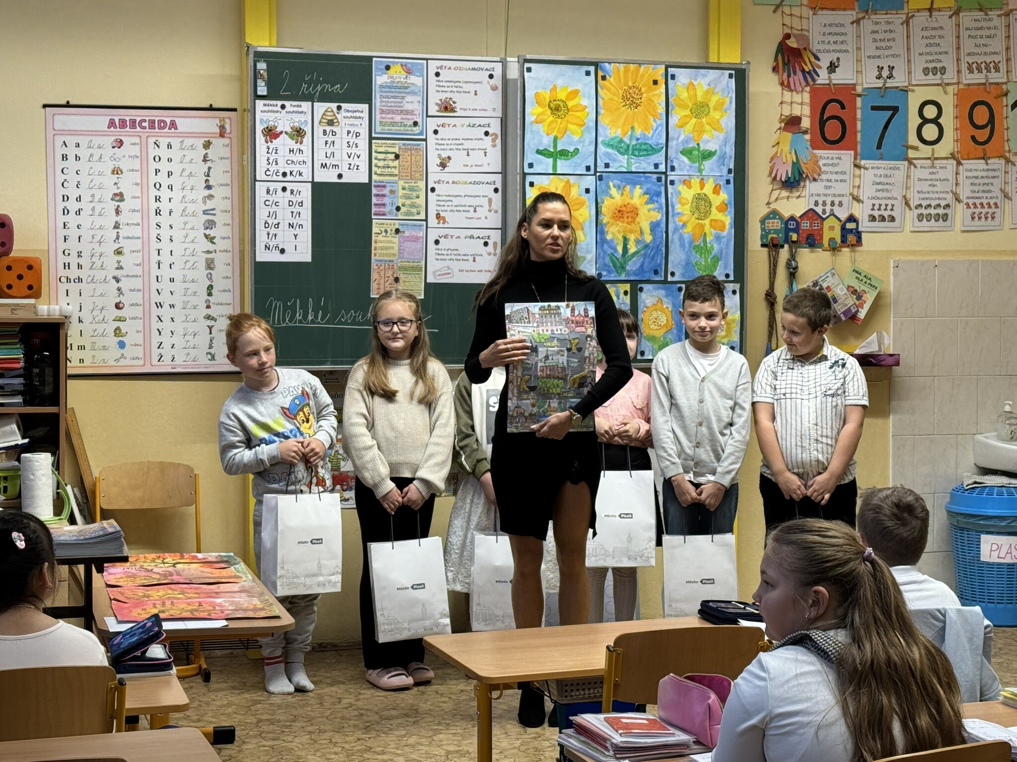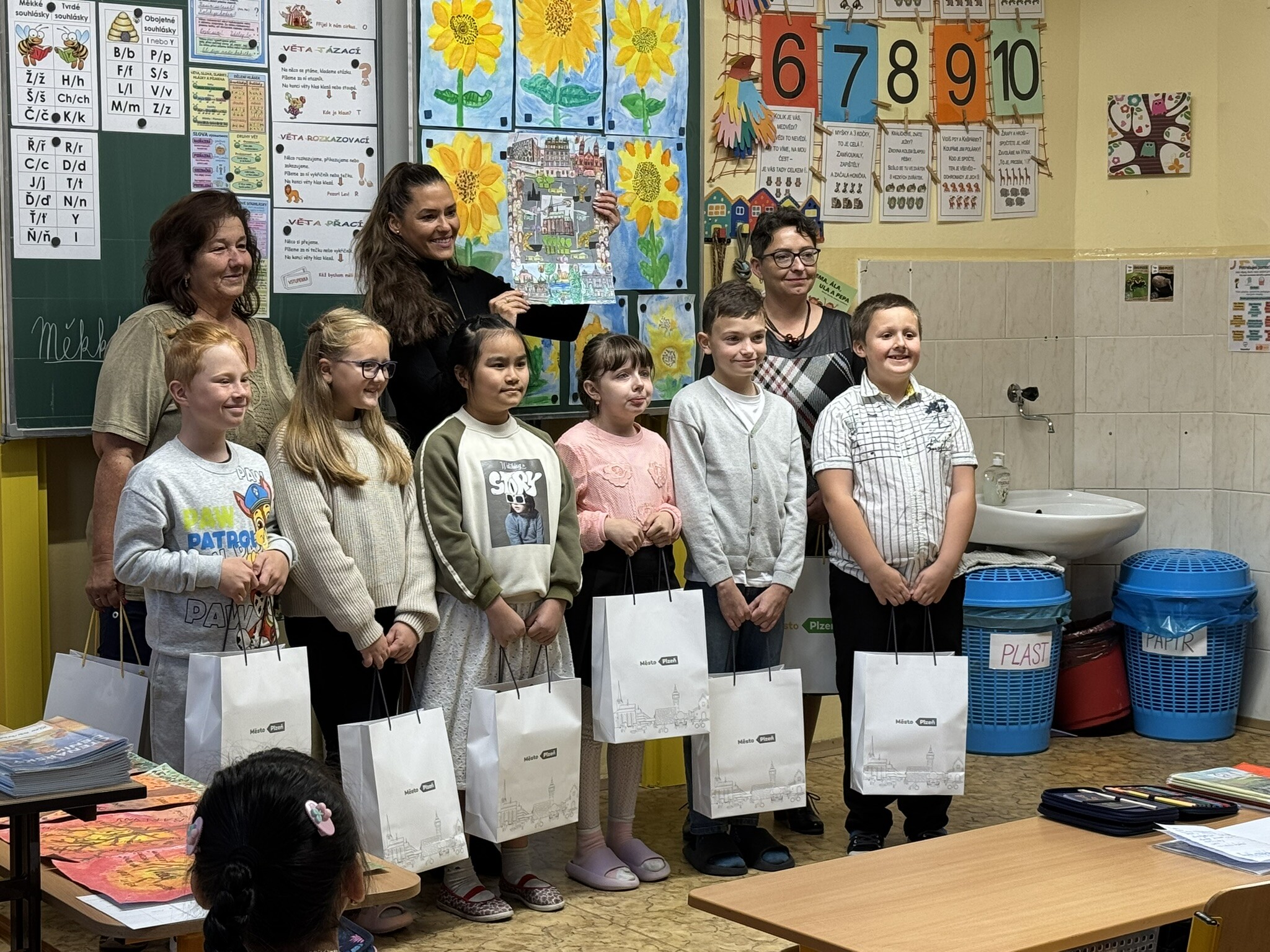 Ve čtvrtek 02. 10. 2025 přišly osobně pogratulovat našim výtvarníkům paní náměstkyně primátora pro oblast školství Lucie Kantorová a vedoucí odboru školství paní Dagmar Škrlantová. Krásné dárky převzali žáci i třídní učitelka J. Krenkelová spolu s paní asistentkou P. Vackovou