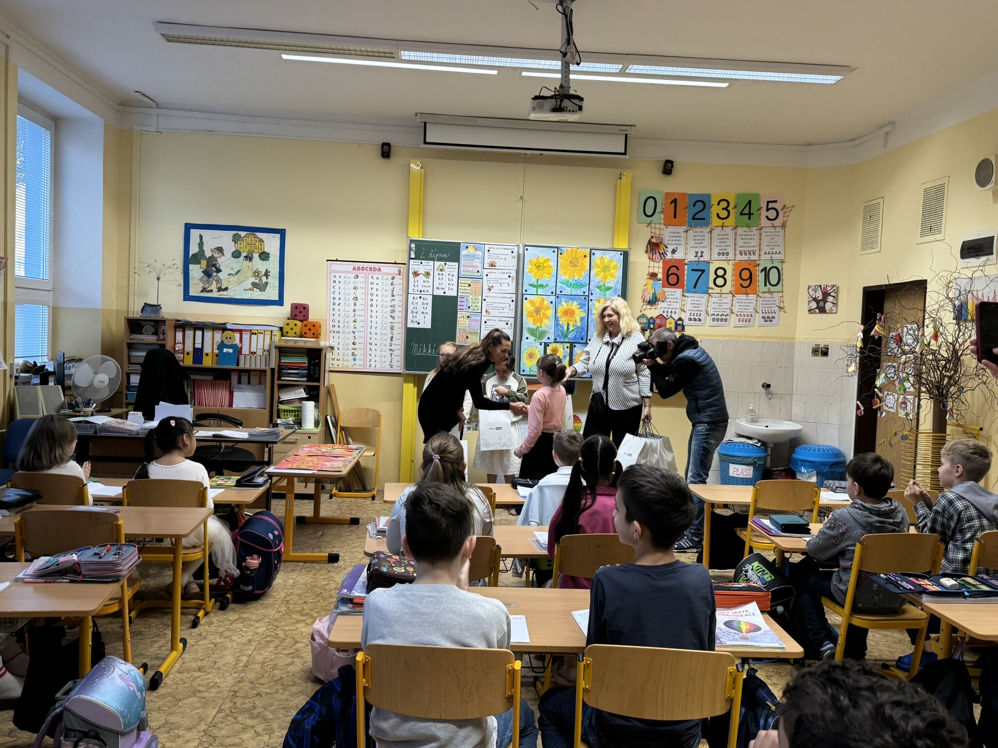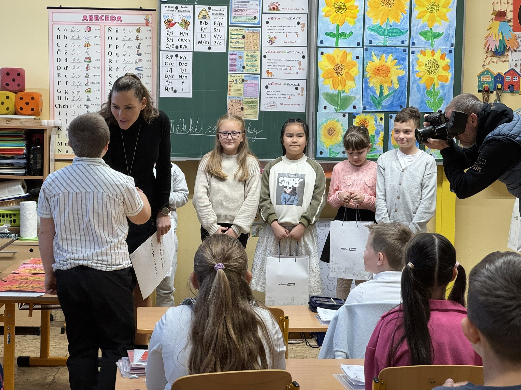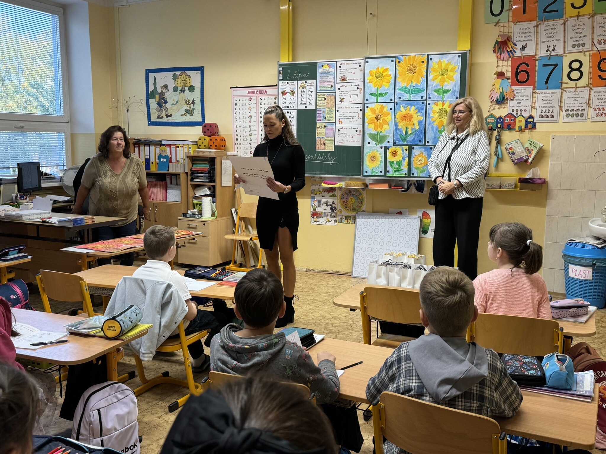 Ve čtvrtek 02. 10. 2025 přišly osobně pogratulovat našim výtvarníkům paní náměstkyně primátora pro oblast školství Lucie Kantorová a vedoucí odboru školství paní Dagmar Škrlantová. Krásné dárky převzali žáci i třídní učitelka J. Krenkelová spolu s paní asistentkou P. Vackovou