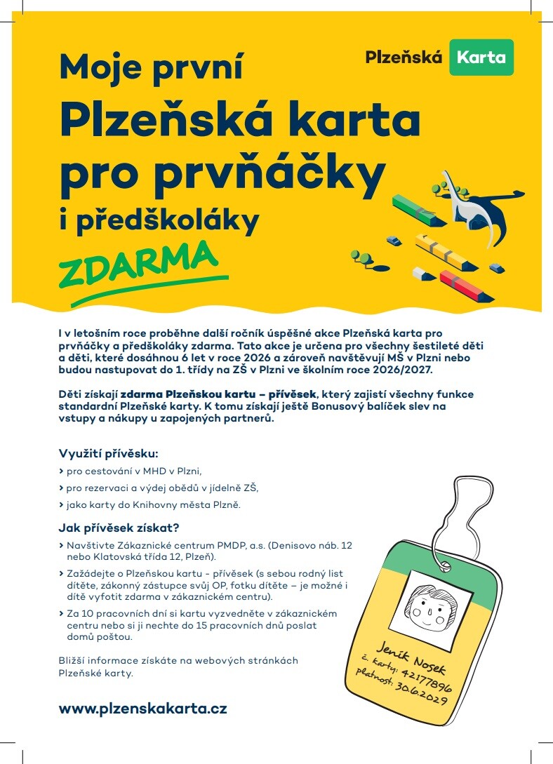 I v letošním roce máme připravené pro Vaše děti Plzeňské karty – přívěsky ZDARMA. Akce s názvem Moje první Plzeňská karta je určena pro všechny šestileté děti a děti, které dosáhnou 6 let v roce 2026 a zároveň navštěvují MŠ v Plzni nebo budou nastupovat do 1. třídy na ZŠ v Plzni ve školním roce 2026/2027.