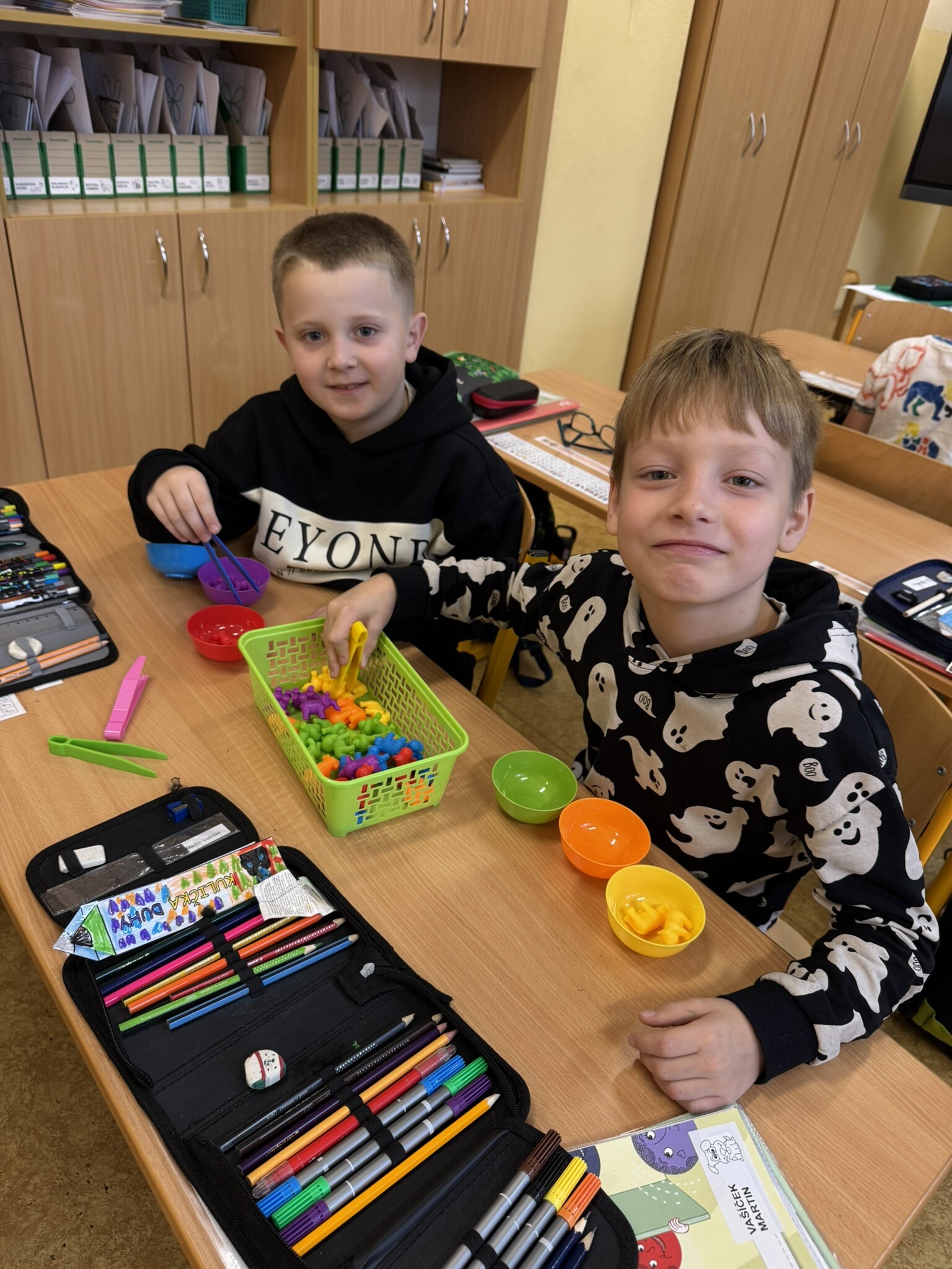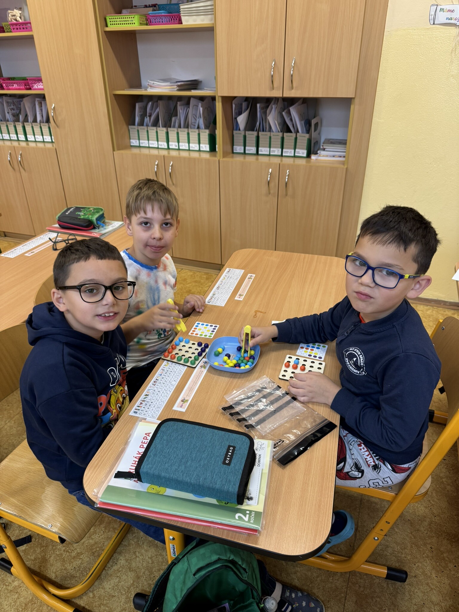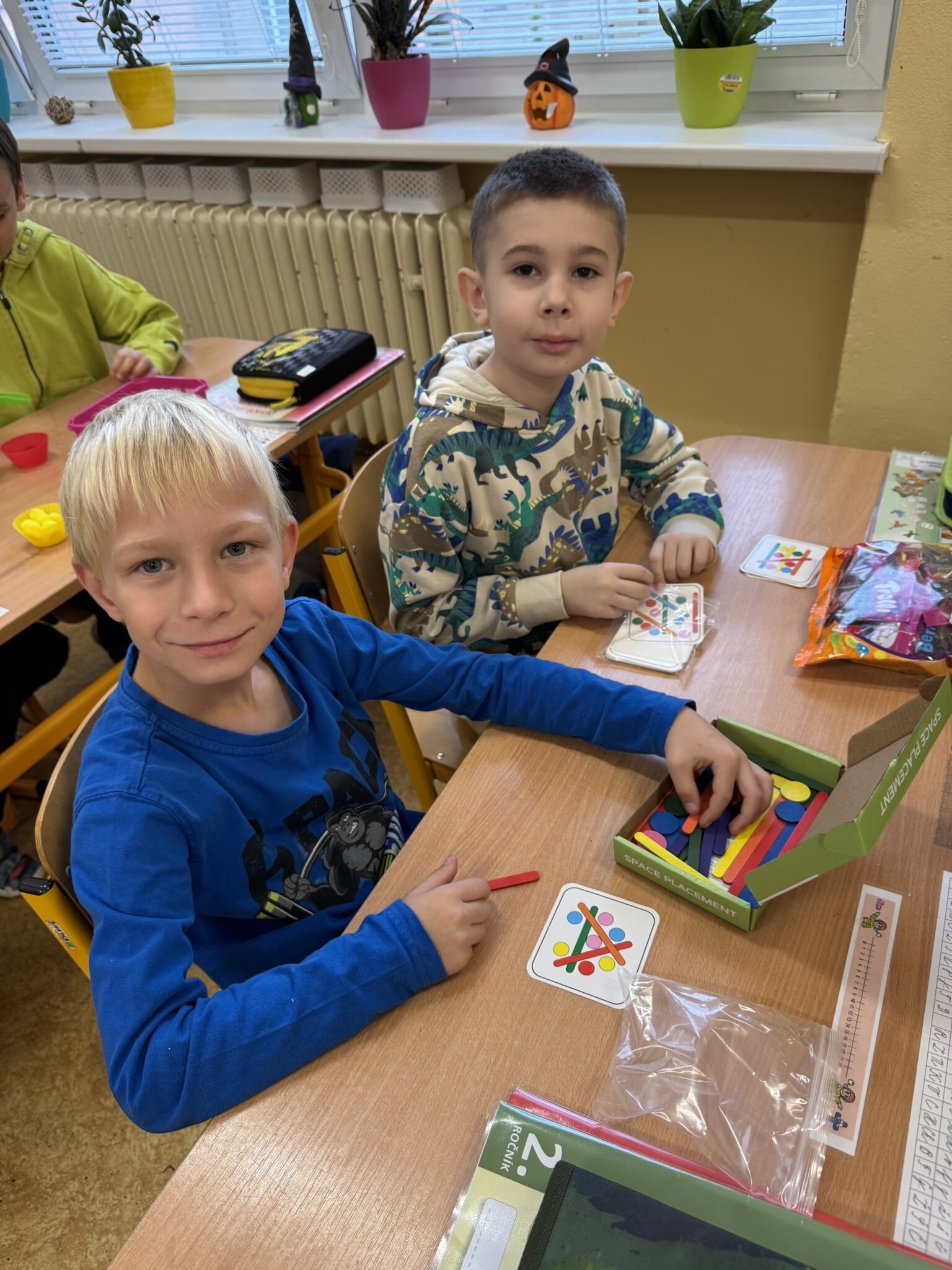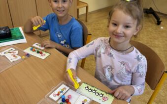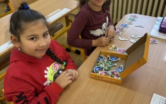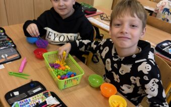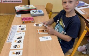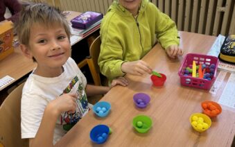 Žáci II. A se na hodinku vrátili do první třídy. V rámci hodiny českého jazyka je čekaly netradiční uvolňovací a grafomotorické cviky zaměřené na uvolnění horních končetin a rozvoje jemné motoriky. K tomu si procvičili zrakové vnímání, ale také pozornost a paměť. V každém centru pro ně byla připravená tematická aktivita jako například malování do krupice, stavění dřívek dle obrázkového vzoru, sbírání kuliček pomocí pinzety, skládání puzzlíků abecedy nebo barevné housenky.