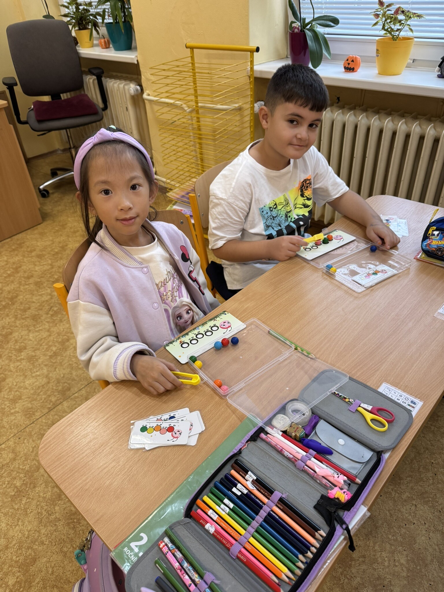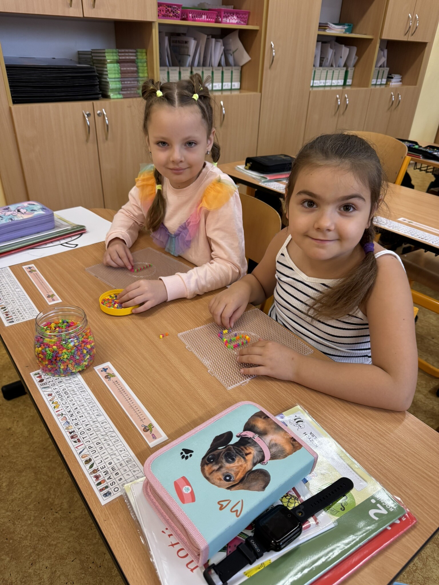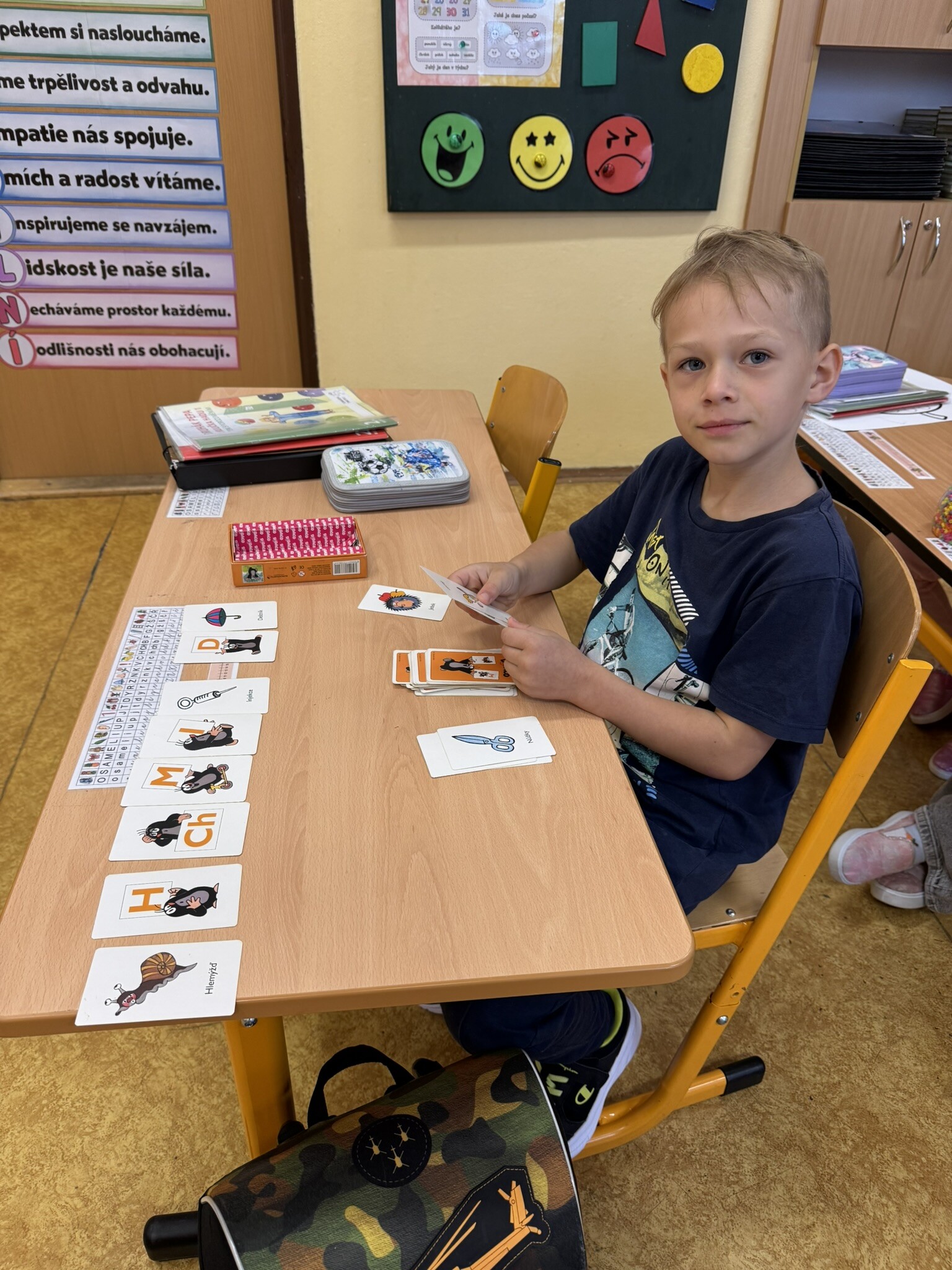 Žáci II. A se na hodinku vrátili do první třídy. V rámci hodiny českého jazyka je čekaly netradiční uvolňovací a grafomotorické cviky zaměřené na uvolnění horních končetin a rozvoje jemné motoriky. K tomu si procvičili zrakové vnímání, ale také pozornost a paměť. V každém centru pro ně byla připravená tematická aktivita jako například malování do krupice, stavění dřívek dle obrázkového vzoru, sbírání kuliček pomocí pinzety, skládání puzzlíků abecedy nebo barevné housenky.