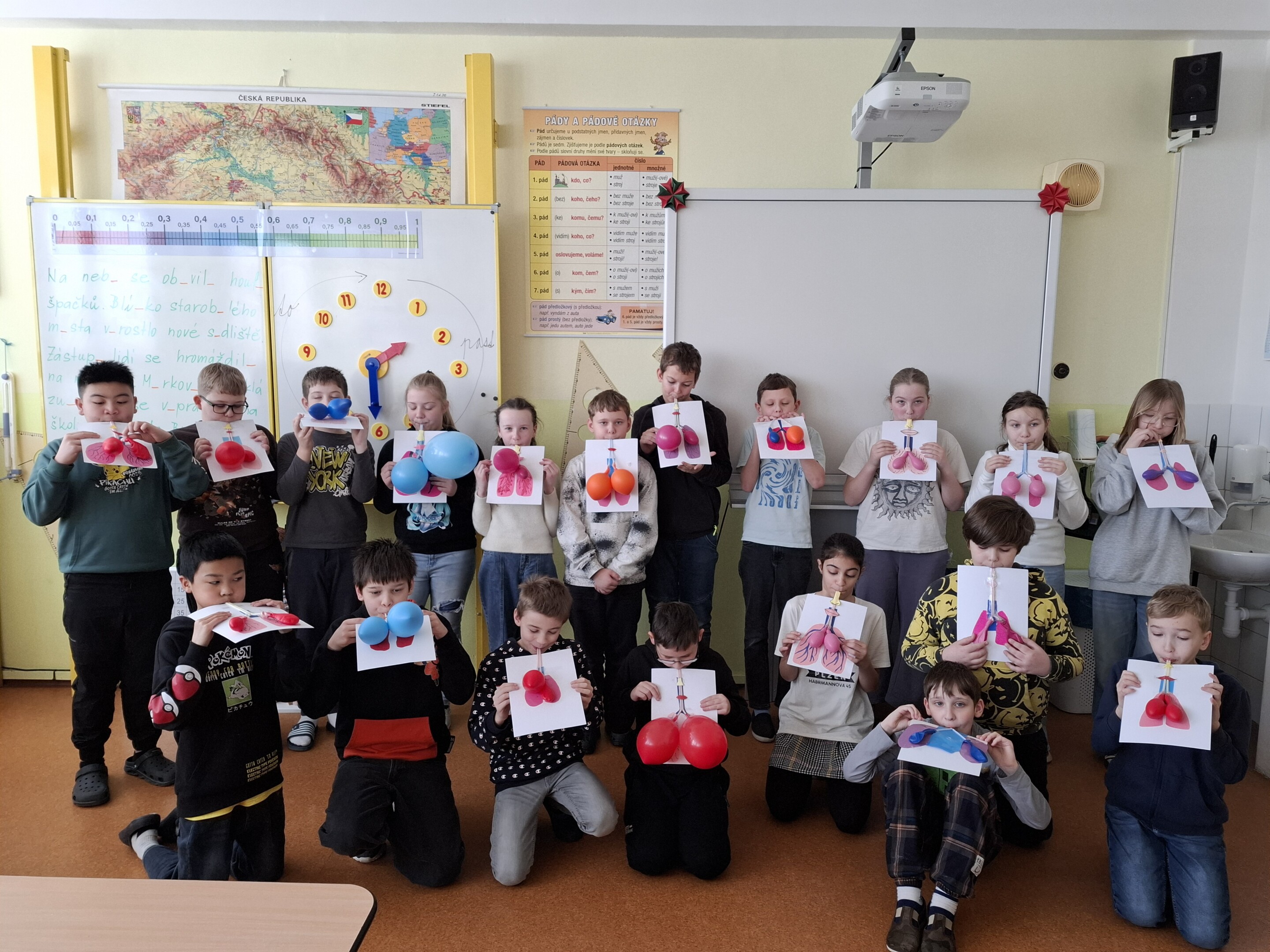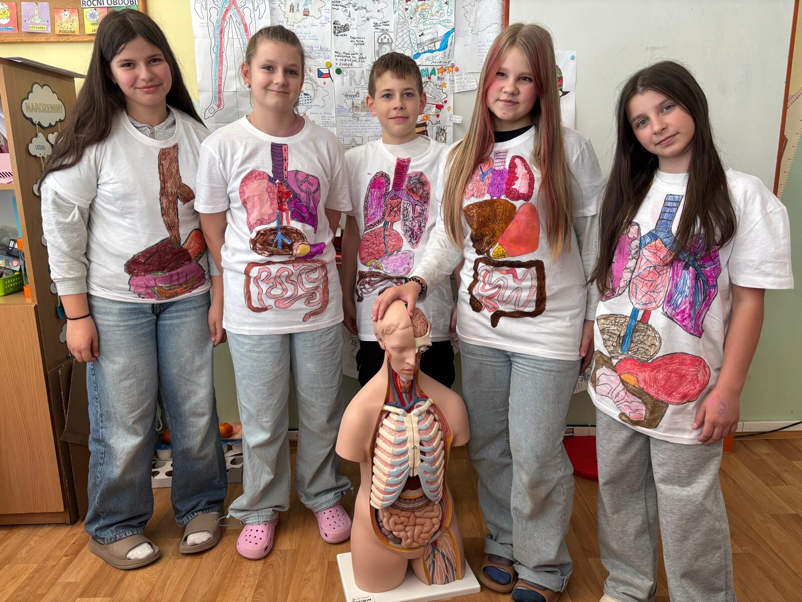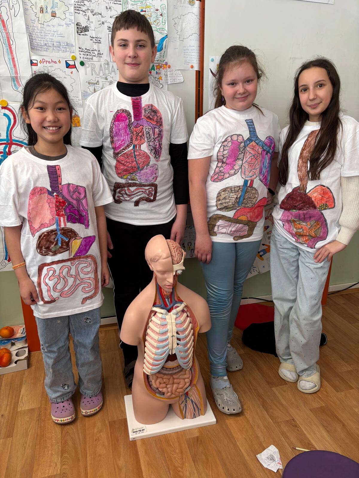Žáci pátých tříd se v přírodovědě pustili do poznávání lidského těla – kostry, svalů, dýchací soustavy a všeho ostatního, bez čeho bychom nemohli existovat. Aby to žáky bavilo, je tato výuka doplněna praktickými činnostmi – měřením tepů, skládáním kostry, výrobou modelu dýchací soustavy, malováním na trička, rozkládání a skládání vnitřních orgánů….Samozřejmě nebude v dalších hodinách chybět ani zdravověda a praktický kurz 1. pomoci. Lékaři z dětí zatím nebudou, ale třeba bude výuka někoho inspirovat při volbě budoucího povolání.