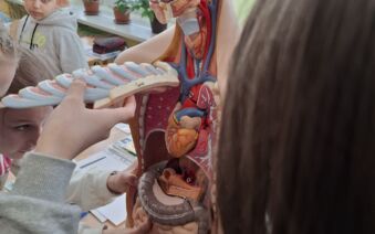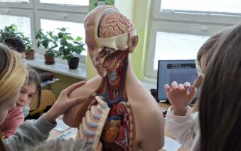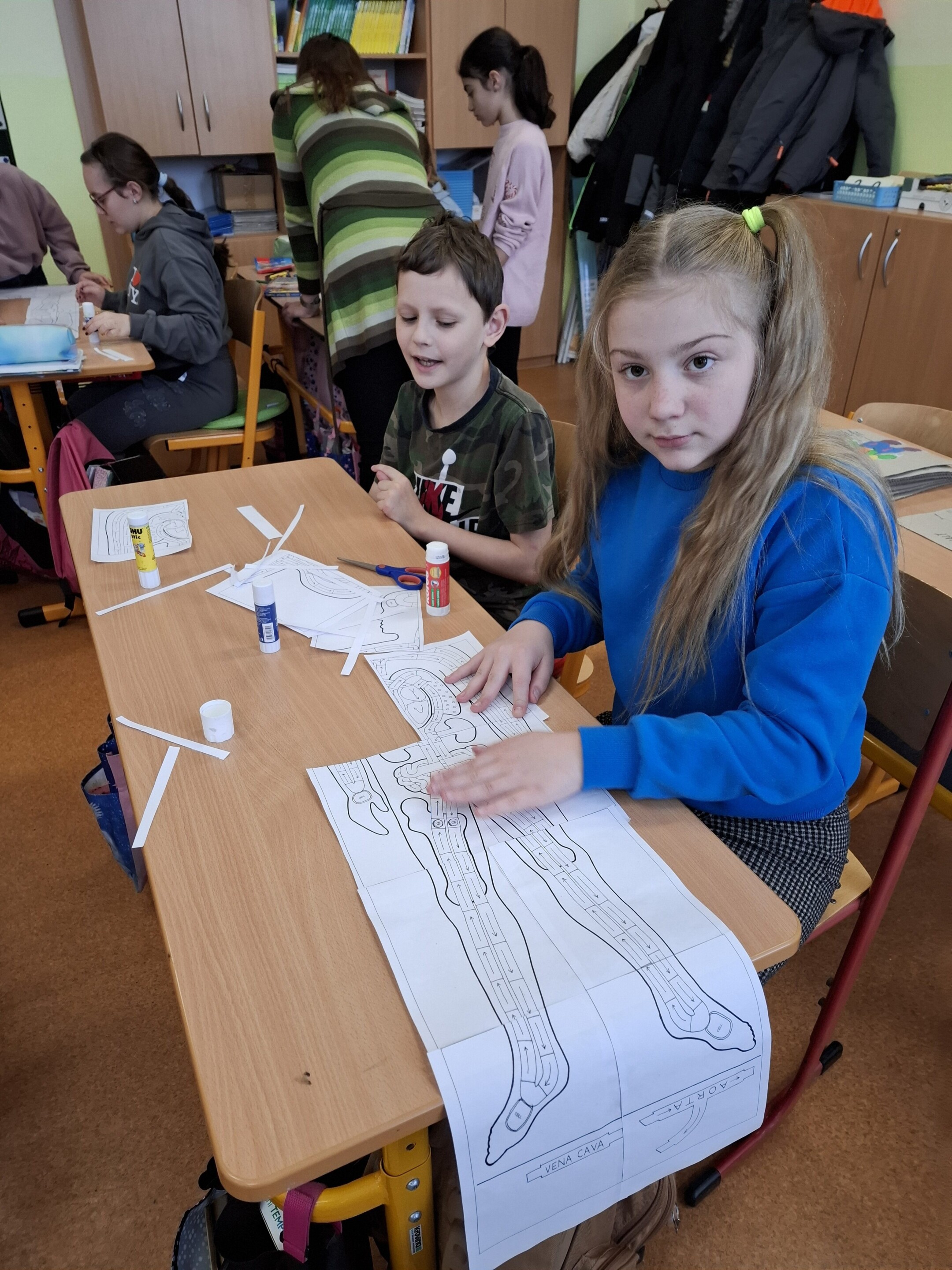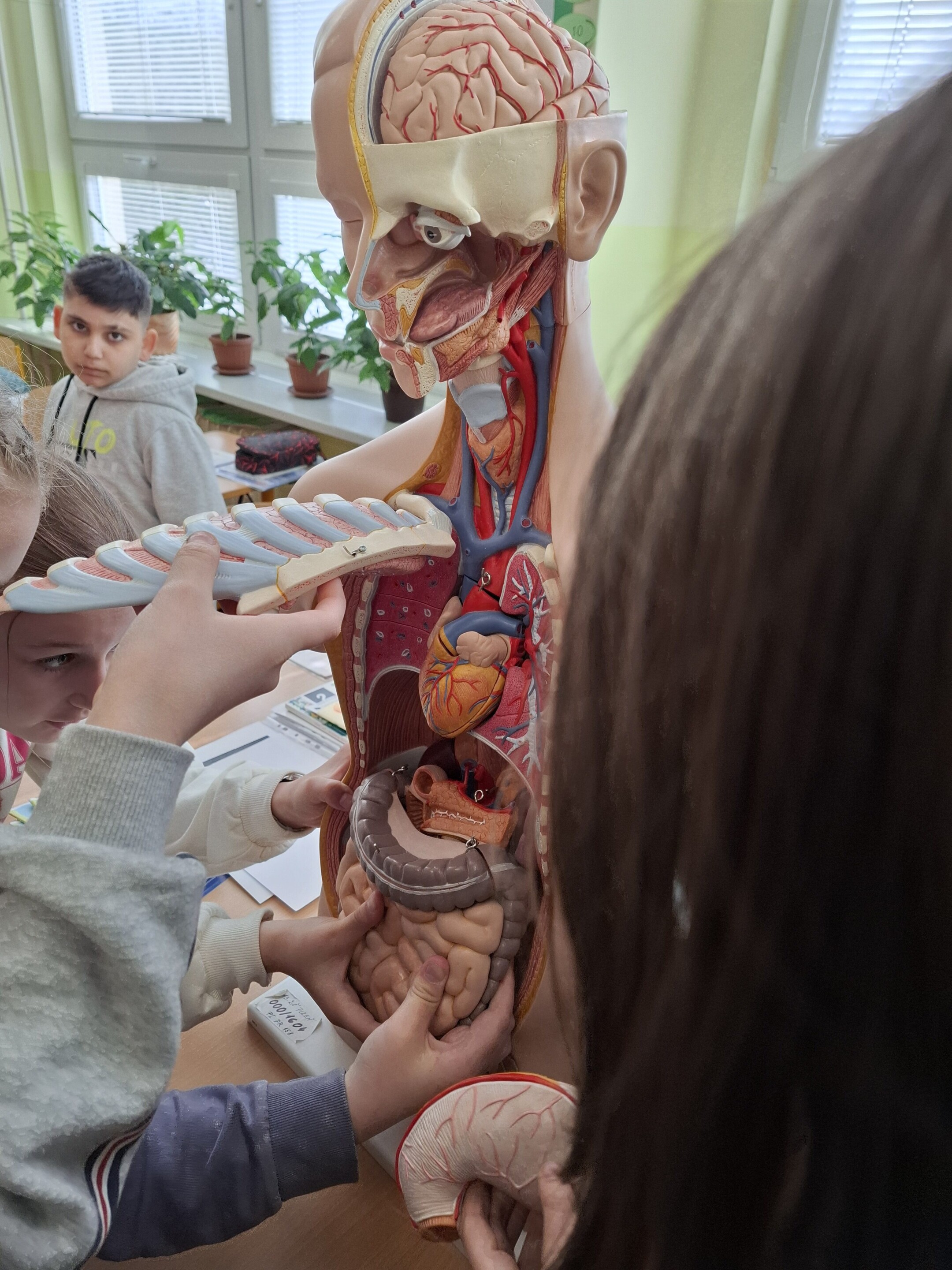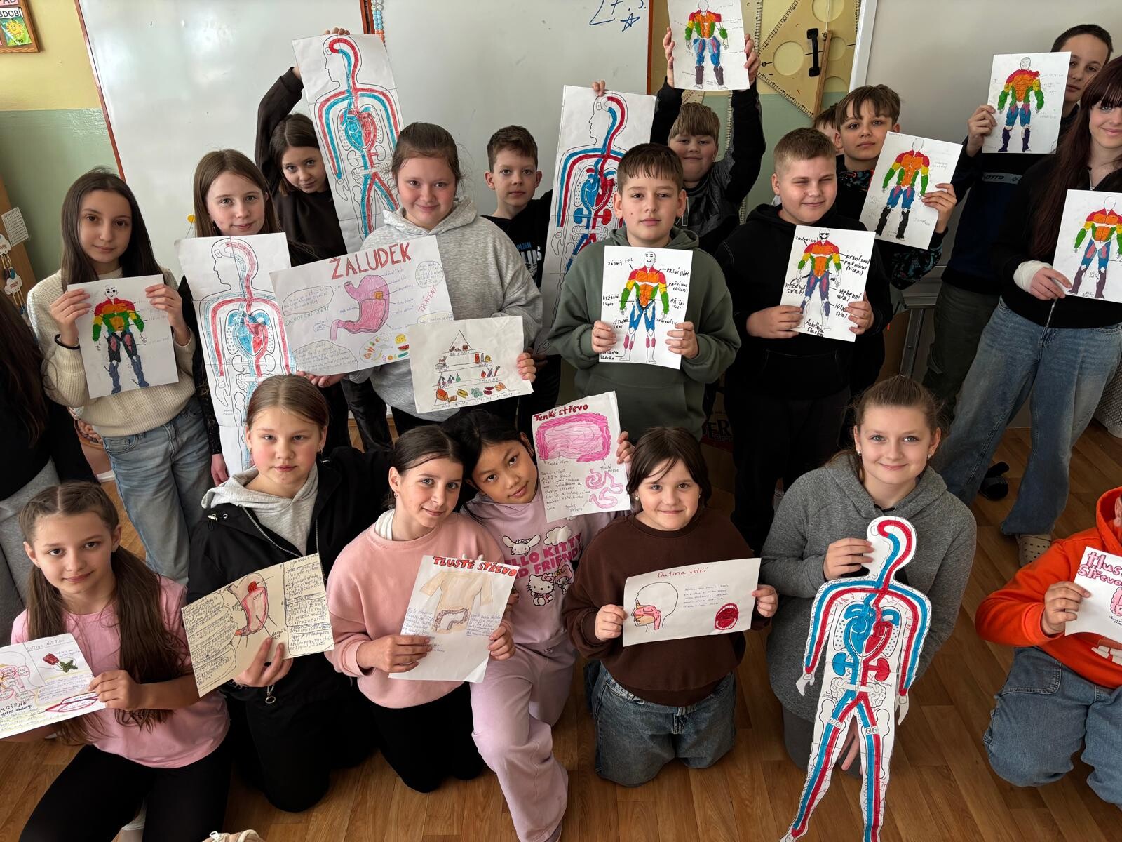 Žáci pátých tříd se v přírodovědě pustili do poznávání lidského těla – kostry, svalů, dýchací soustavy a všeho ostatního, bez čeho bychom nemohli existovat. Aby to žáky bavilo, je tato výuka doplněna praktickými činnostmi – měřením tepů, skládáním kostry, výrobou modelu dýchací soustavy, malováním na trička, rozkládání a skládání vnitřních orgánů….Samozřejmě nebude v dalších hodinách chybět ani zdravověda a praktický kurz 1. pomoci. Lékaři z dětí zatím nebudou, ale třeba bude výuka někoho inspirovat při volbě budoucího povolání.