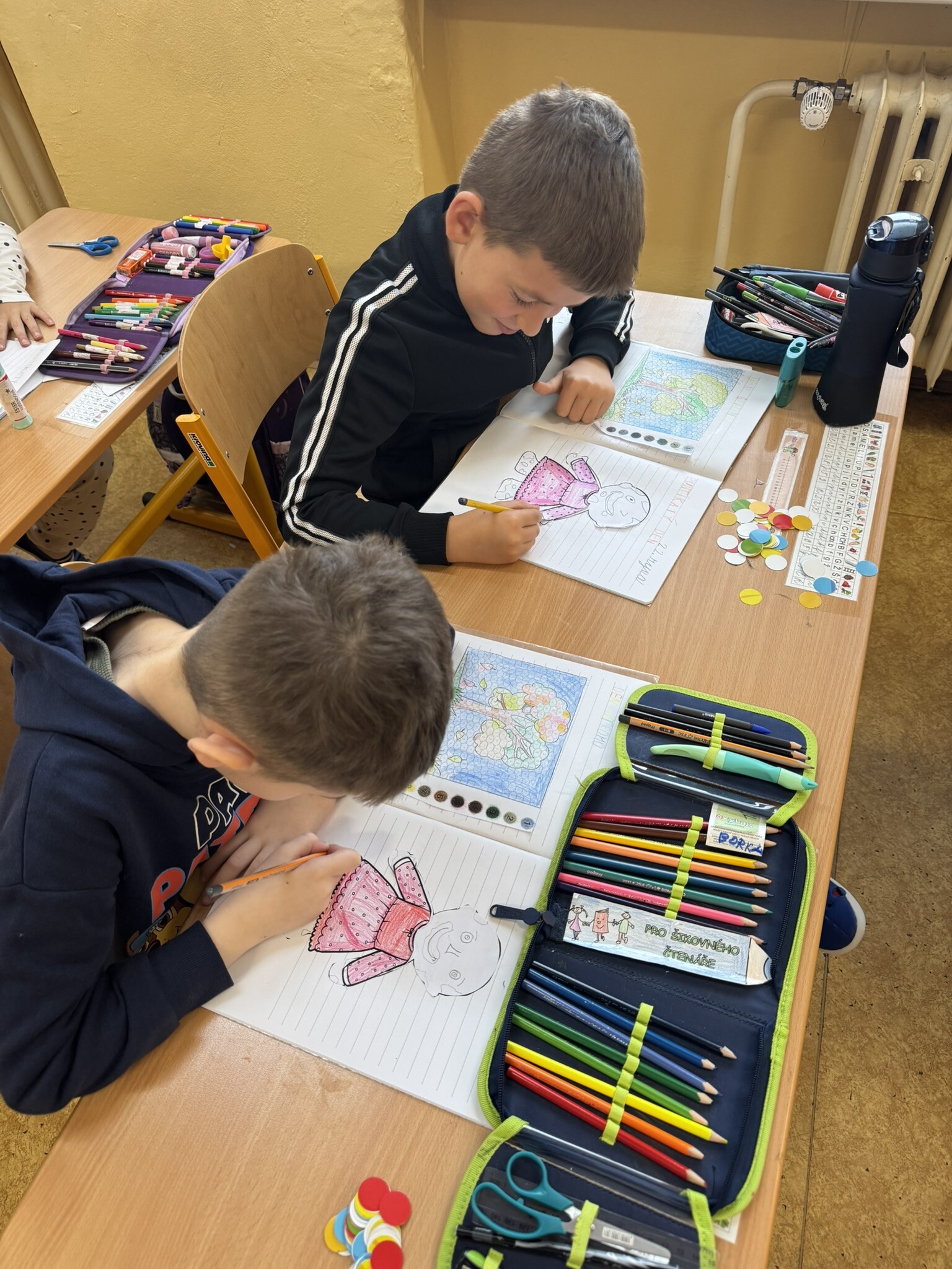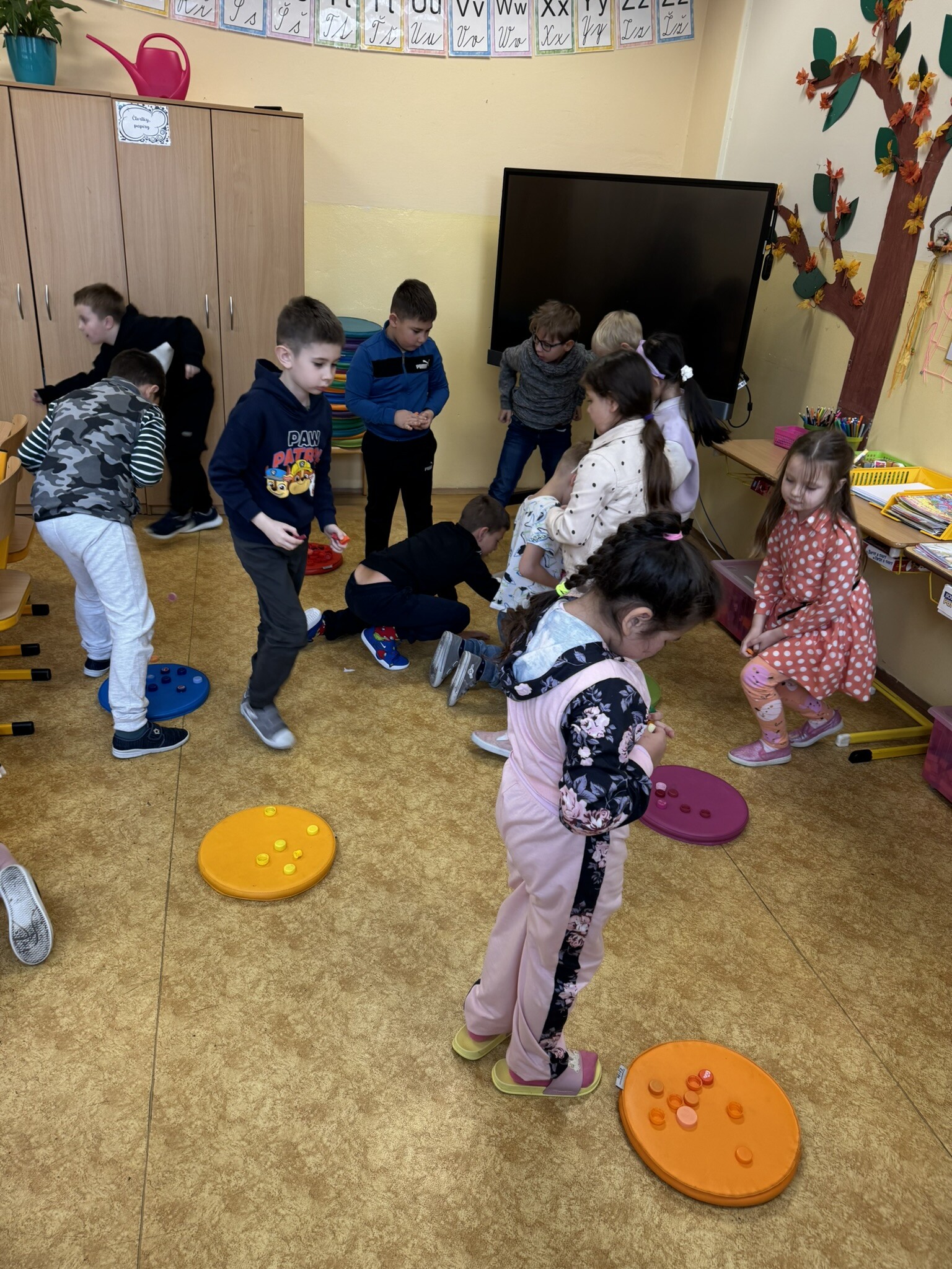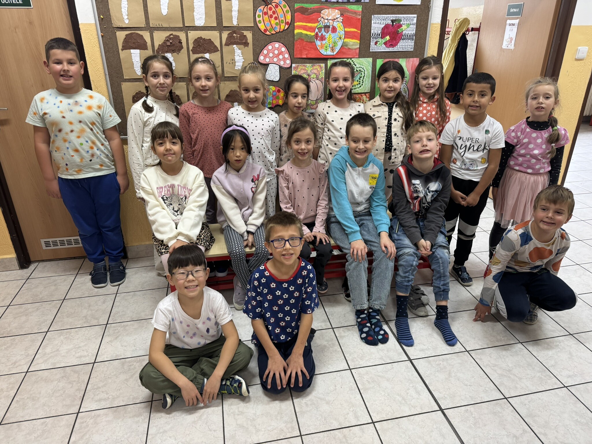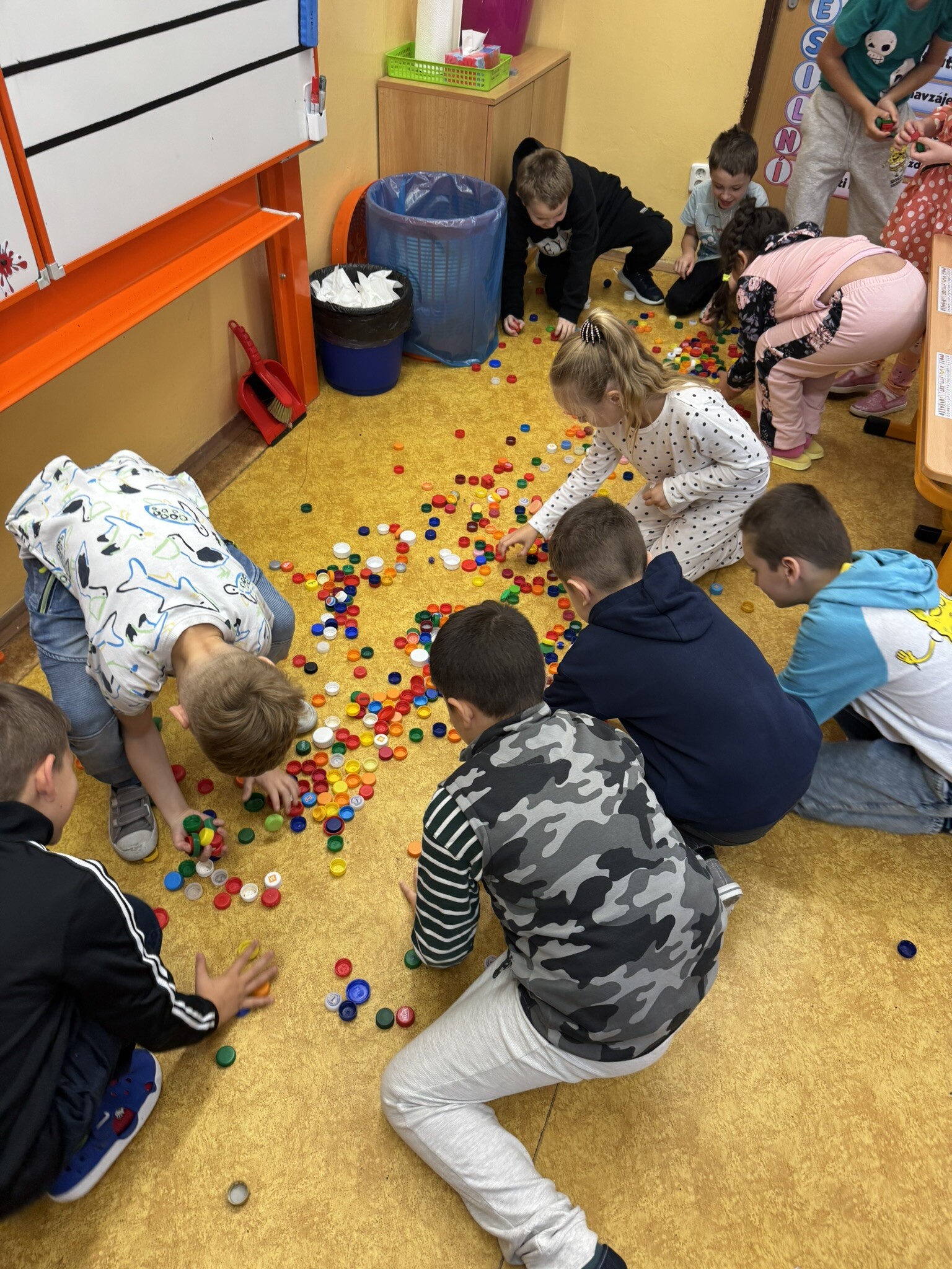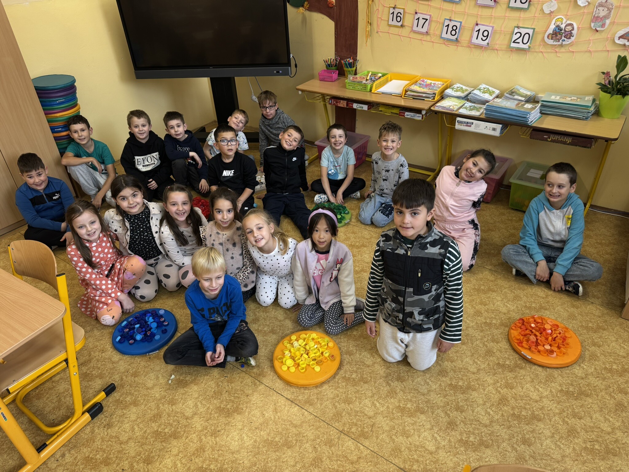 Do Puntíkového dne se aktivně zapojily i děti z přípravných ročníků a druhých tříd, které celý den provázely puntíky nejrůznějších barev a velikostí. Puntíky se objevovaly nejenom na oblečení, ve kterém přišli naši žáčci do školy, ale i ve všech vyučovacích předmětech. Děti počítaly puntíkové příklady, vybarvovaly obrázky s puntíky, z barevných kulatých podsedáků tvořily obrázky, hrály si s barevnými víčky, ze kterých sestavovaly známá písmena i slova. Barevná víčka sloužila jako malé barevné puntíky i k drobným pohybovým hrám a cvičením.