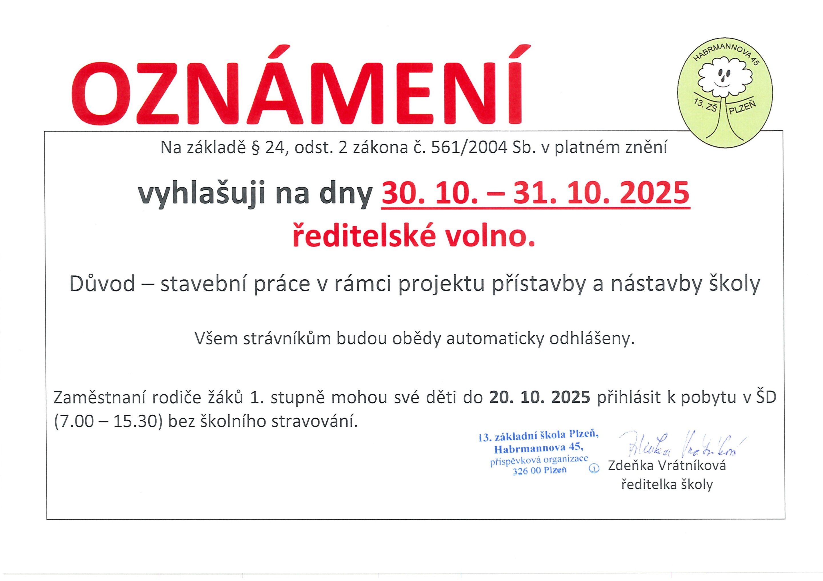 bylo vyhlášeno ředitelské volno na dny 30.-31. 10. 2025 čtvrtek a pátek po podzimních prázdninách).