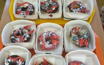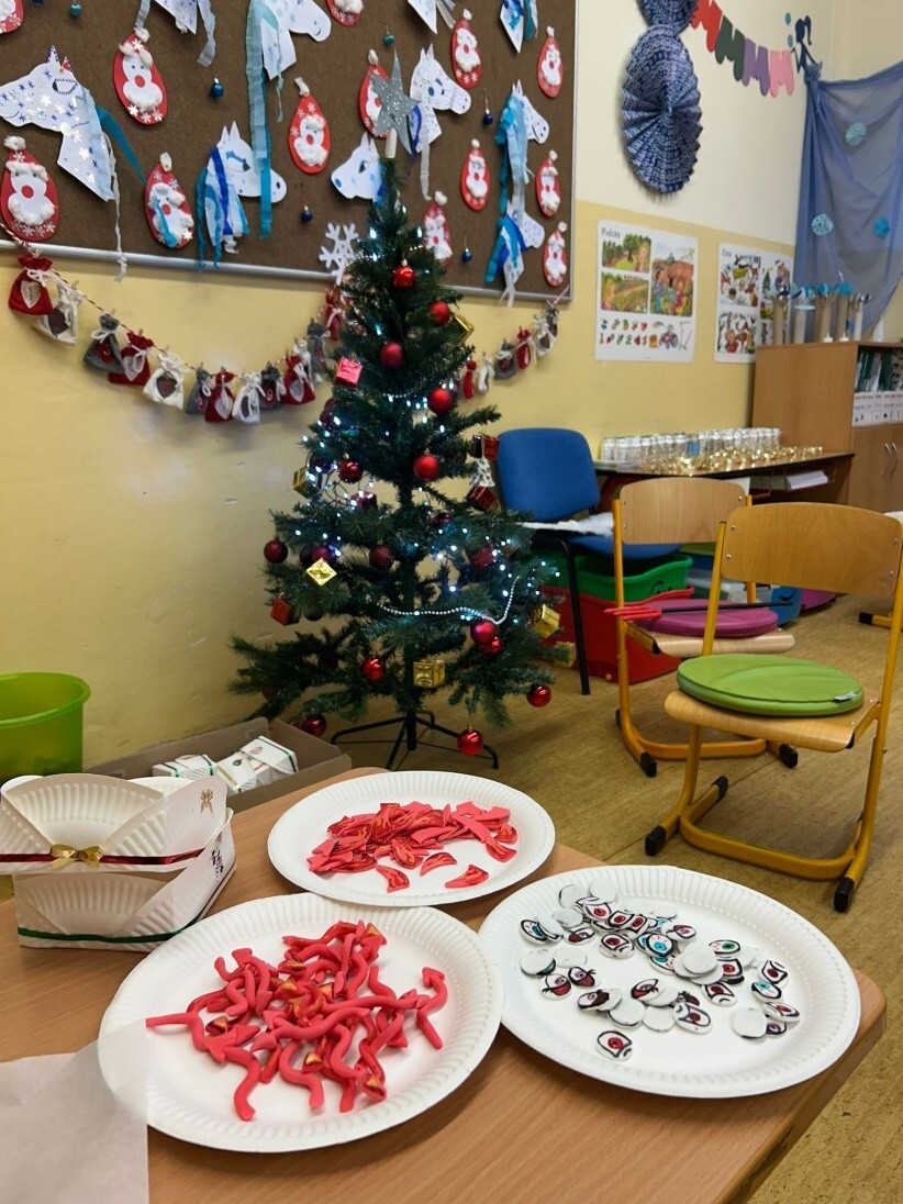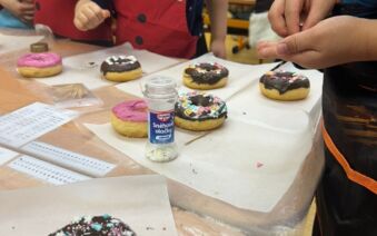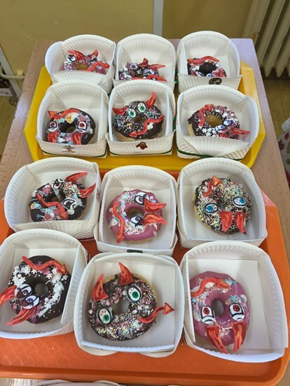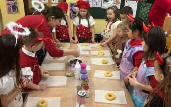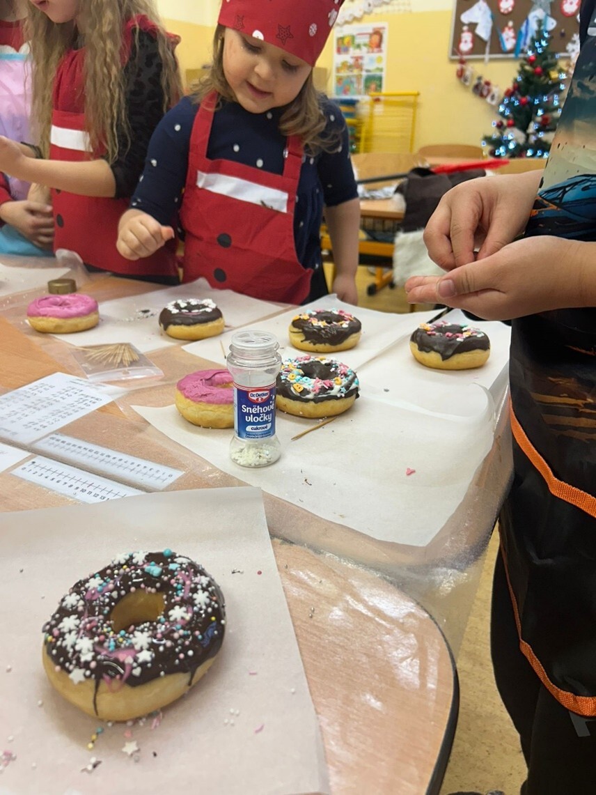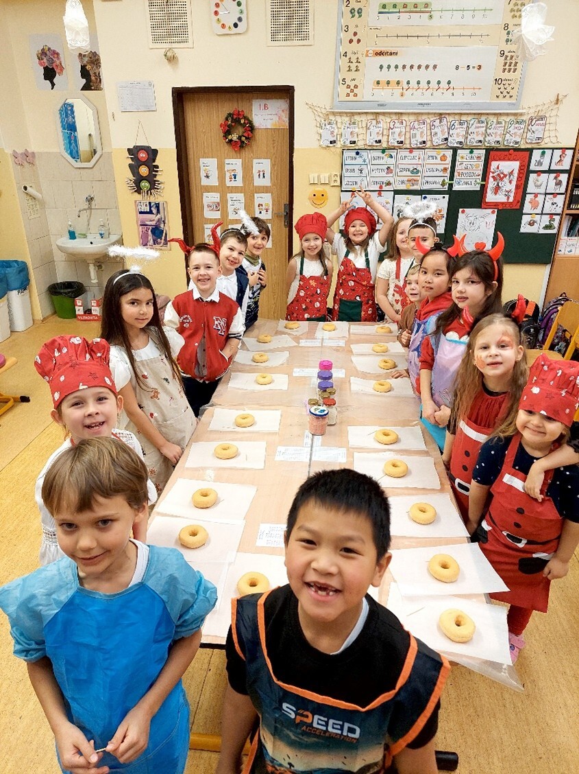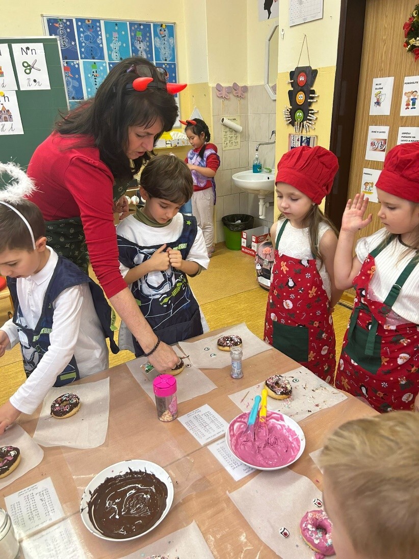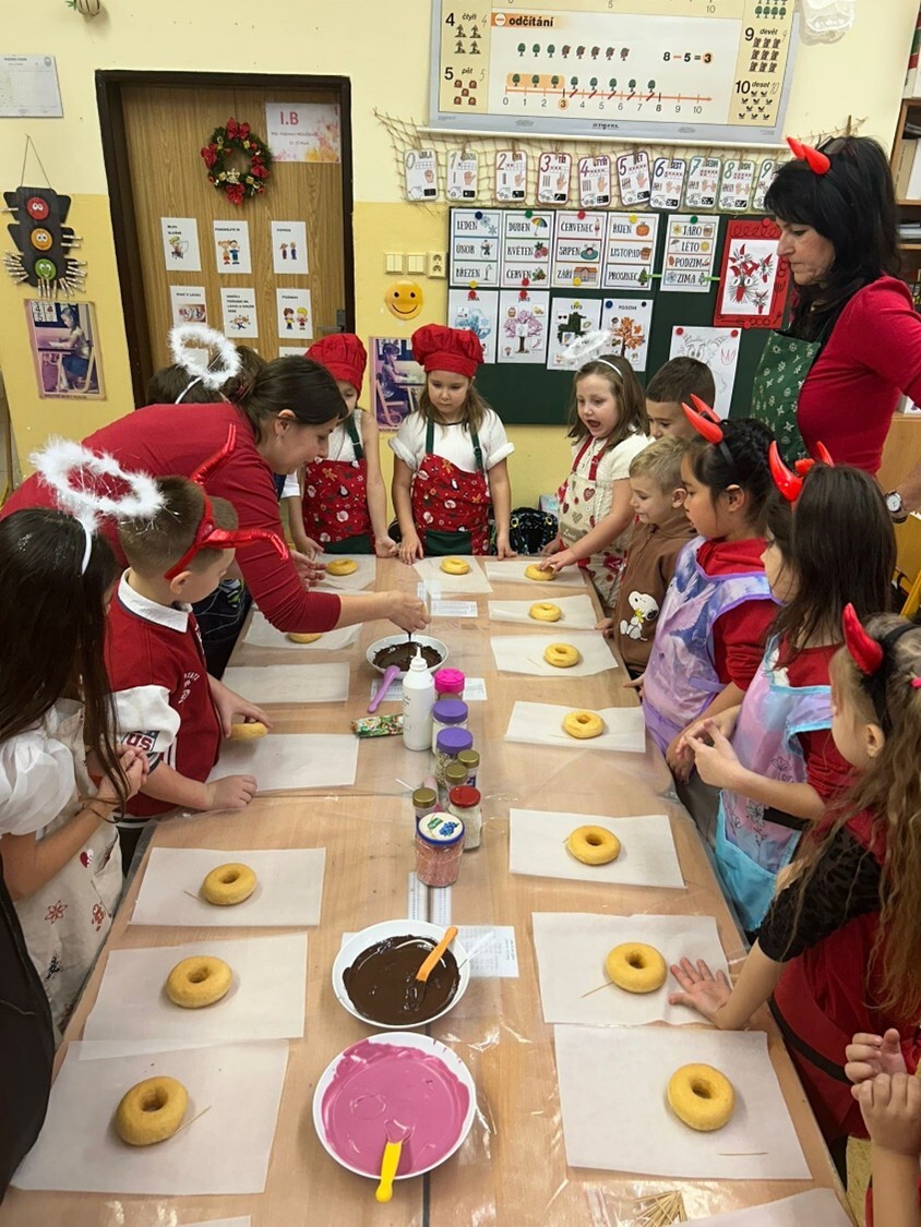 Po zpívání přišlo tvoření – děti si přinesly zástěry a těšily se na překvapení. Jedna z maminek našich žákyň pro nás připravila speciální cukrářský program. Děti upravily lavice na sladké tvoření a každý dostal jeden suchý donut, ze kterého tvořily čertíka. Zdobit donuty mohl každý podle své fantazie, na výběr byly polevy čokoládové i jahodové, sypání nejrůznějších tvarů a barev. Nakonec na čertíky přilepily polevou oči, rohy a ocas.