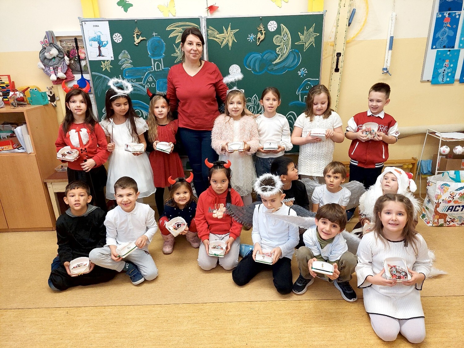 V 1. B jsme si letos opravdu užili Mikuláše – a to pěkně čertovsky! Děti přišly do školy oblečeny většinou jako čerti, andělé a dokonce se objevil i jeden Mikuláš. Barevné kostýmy a nadšené tváře proměnily naši třídu v malý mikulášský svět plný radosti a smíchu.